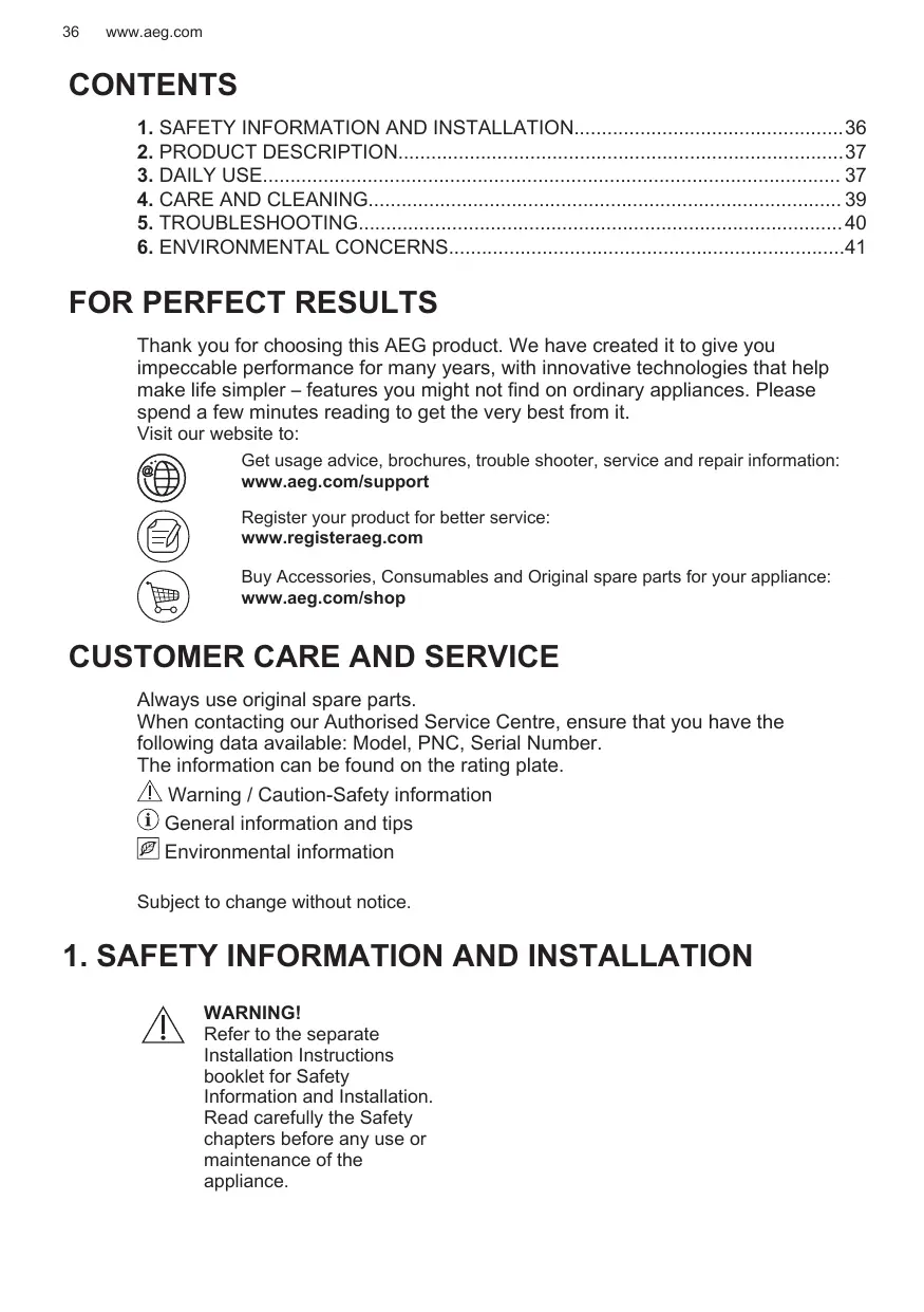 Get usage advice, brochures, trouble shooter, service and repair information: www.aeg.com/support