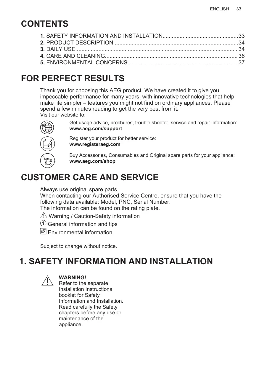 FOR PERFECT RESULTS Thank you for choosing this AEG product. We have created it to give you impeccable performance for many years, with innovative technologies that help make life simpler – features you might not find on ordinary appliances. Please spend a few minutes reading to get the very best from it. Visit our website to: