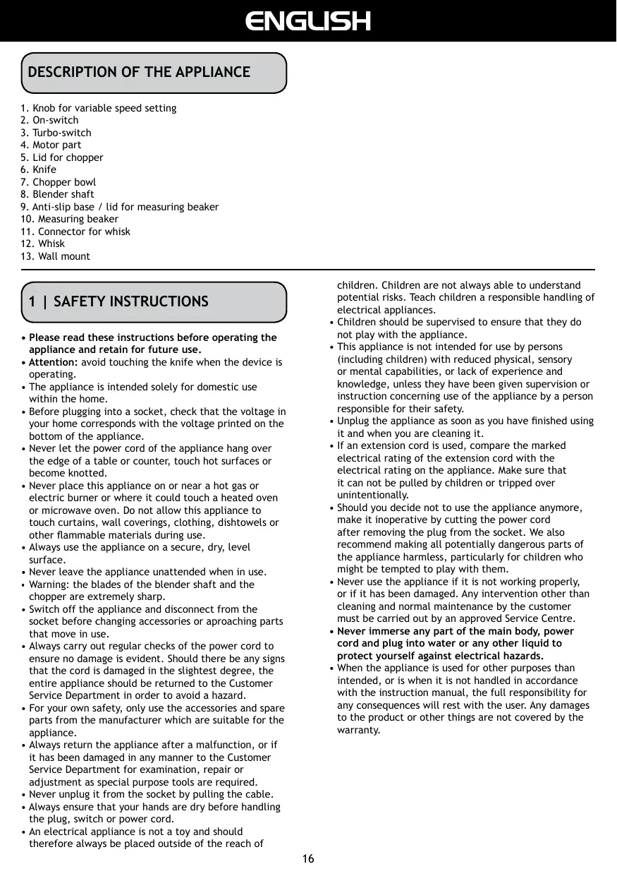 Avant d’utiliser l’appareil pour la première fois, il faut procéder aux opérations suivantes: déballez l’appareil en les accessoires avec précaution et retirez tout le matériel d’emballage. Veillez à ce que le matériel d’emballage (sacs en plastique et carton) soit hors de portée des enfants. Après avoir retiré l’appareil de son emballage, contrôlez minutieusement s’il n y a pas de dommages visibles, éventuellement causés pendant le transport. Rincez tous les accessoires avec l’eau chaude savonneuse et essuyez-les avec précision: - pied du batteur plongeur 8 - fouet 12 - gobelet gradué avec pied antidérapant/couvercle 9+10 - moulin hachoir 7 Avec le fouet on peut par exemple battre des blancs d’œufs ou crème fraîche. Prenez le bloc moteur 4, le pièce d’attelage 11 et le fouet 12. Cliquez le fouet dans le pièce d’attelage. Tournez le fouet à droite au bloc moteur. Contrôlez si le bouton du variateur de vitesse 1 est sur - o, une position qui donne les meilleurs résultats pour avoir des blancs d’œufs et de la crème fraîche mousseuse. Mettez les ingrédients à fouetter dans le gobelet gradué. Veillez que le gobelet ne soit pas trop rempli (max. 400 ml). Branchez l’appareil. Mettez le fouet dans le gobelet et poussez le bouton - marche -2 pour utiliser la vitesse que vous aviez choisi avec le variateur de vitesse. Du moment que vous relâchez le bouton marche/arrêt le fouet. Pour enlever le fouet du batteur plongeur, vous devez le tourner vers le gauche.