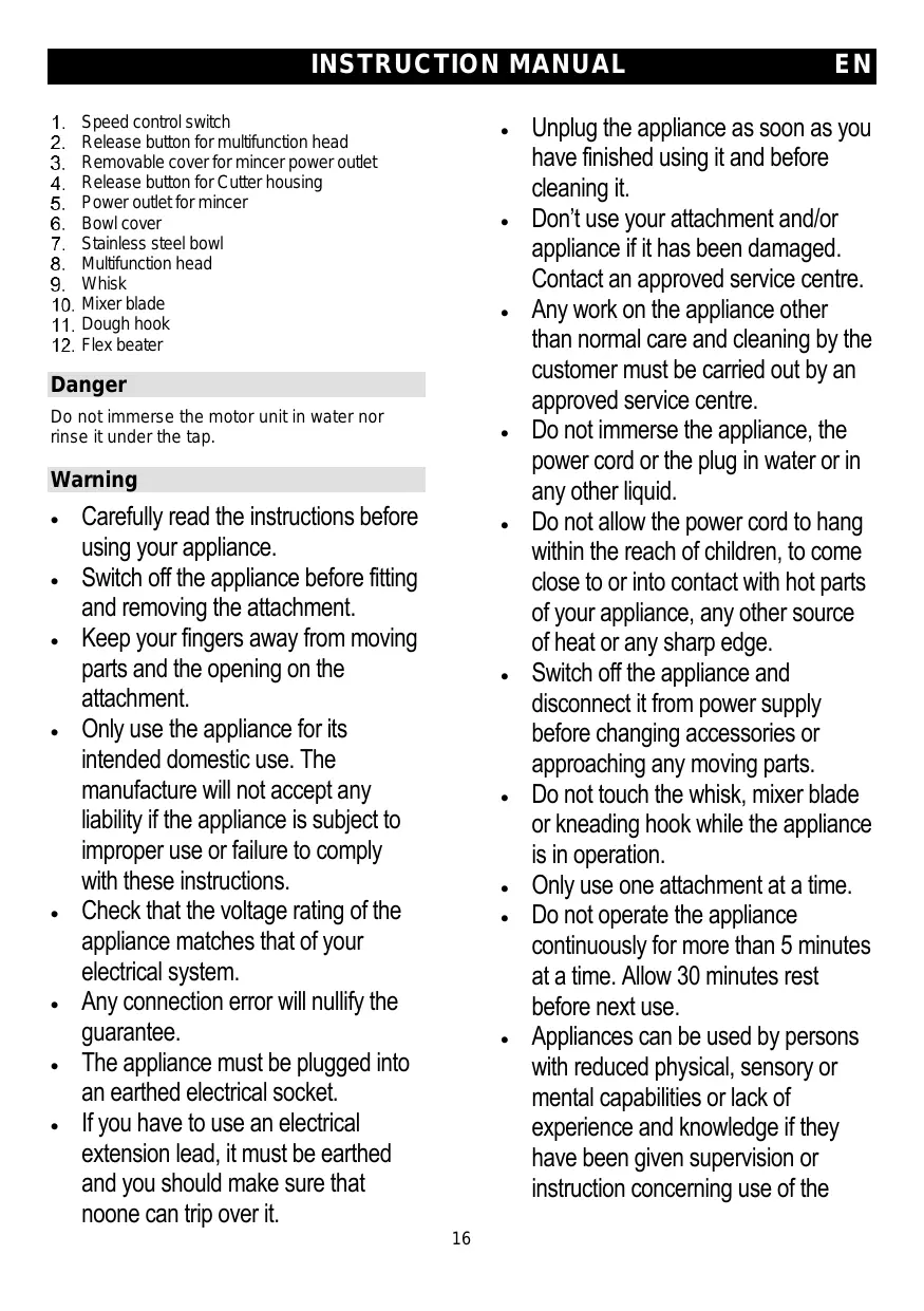 N'utilisez pas votre appareil et/ou ses accessoires s'ils ont été endommagés. Contactez le service après-vente agréé. Toute intervention autre que le nettoyage et l'entretien habituels effectués par l'utilisateur doit être réalisée par le service après-vente agréé. Ne plongez jamais l'appareil, le cordon d'alimentation ou la fiche dans l'eau ni dans tout autre liquide. Ne laissez jamais le cordon secteur pendre à la portée des enfants ; il ne doit jamais toucher les parties chaudes de votre appareil, se trouver à proximité d'une source de chaleur ou reposer sur un bord tranchant. Éteignez l'appareil et débranchez-le avant d'insérer ou de retirer les accessoires et avant d'approcher vos mains des pièces en mouvement. Ne touchez pas le fouet, les batteurs plats ou le crochet pétrisseur pendant que l'appareil est en marche. N'employez qu'un seul accessoire à la fois.