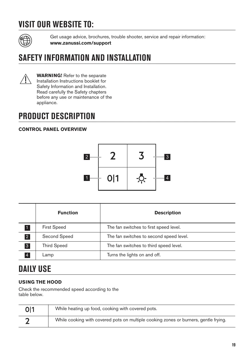 DAILY USE USING THE HOOD Check the recommended speed according to the table below.