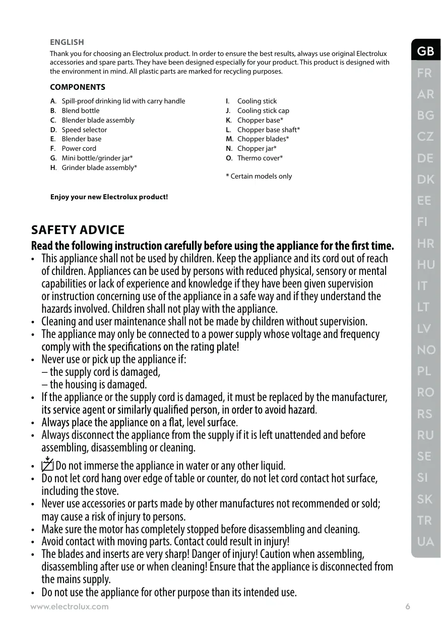 • • Always disconnect the appliance from the supply if it is left unattended and before assembling, disassembling or cleaning. Do not immerse the appliance in water or any other liquid. • • Do not let cord hang over edge of table or counter, do not let cord contact hot surface, including the stove. • Never use accessories or parts made by other manufactures not recommended or sold; may cause a risk of injury to persons. • Make sure the motor has completely stopped before disassembling and cleaning. • Avoid contact with moving parts. Contact could result in injury! • The blades and inserts are very sharp! Danger of injury! Caution when assembling, disassembling after use or when cleaning! Ensure that the appliance is disconnected from the mains supply. • Do not use the appliance for other purpose than its intended use. www.electrolux.com