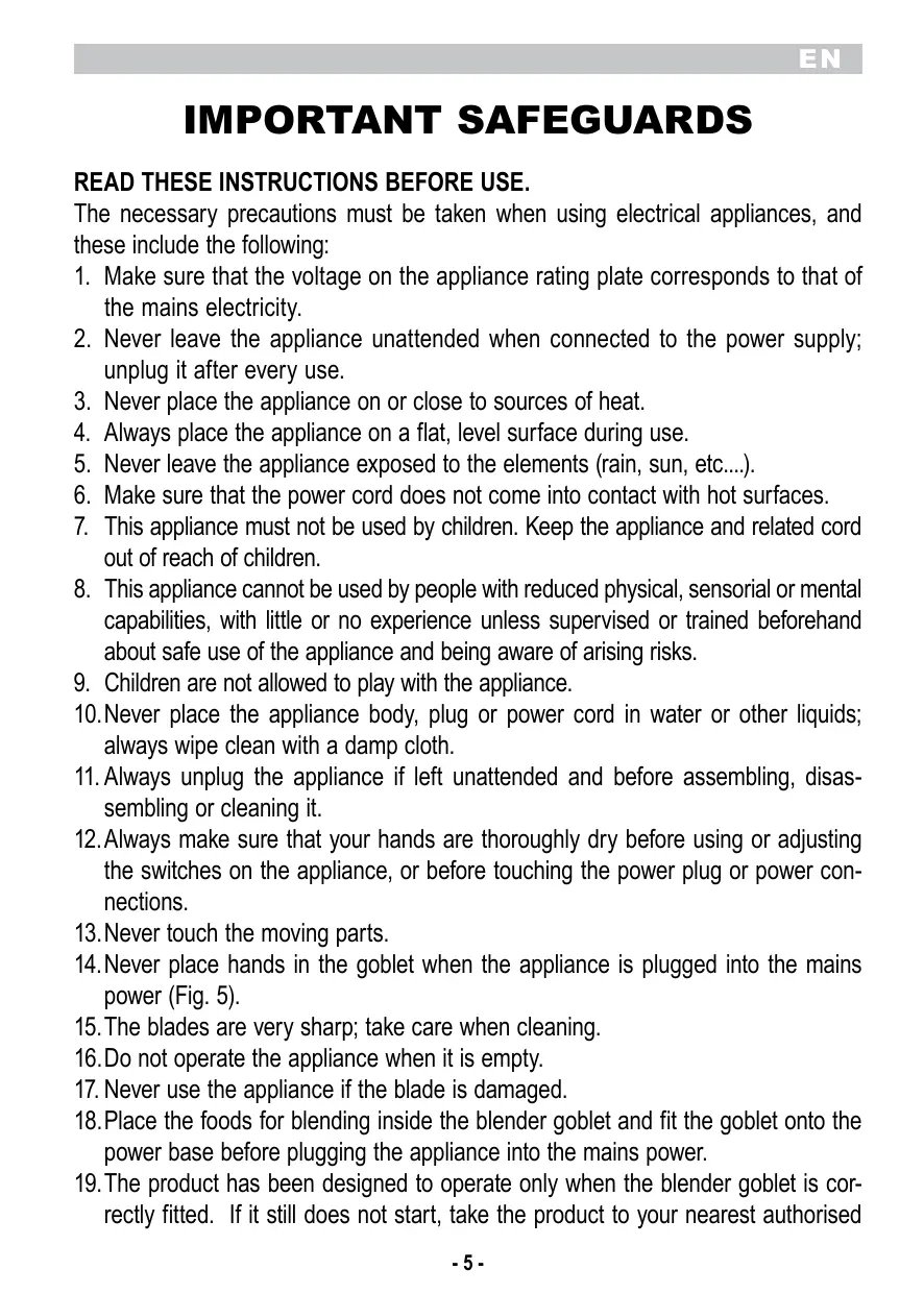 IMPORTANT SAFEGUARDS READ THESE INSTRUCTIONS BEFORE USE. The necessary precautions must be taken when using electrical appliances, and these include the following: 1. Make sure that the voltage on the appliance rating plate corresponds to that of the mains electricity. 2. Never leave the appliance unattended when connected to the power supply; unplug it after every use. 3. Never place the appliance on or close to sources of heat. 4. Always place the appliance on a flat, level surface during use. 5. Never leave the appliance exposed to the elements (rain, sun, etc....). 6. Make sure that the power cord does not come into contact with hot surfaces. 7. This appliance must not be used by children. Keep the appliance and related cord out of reach of children. 8. This appliance cannot be used by people with reduced physical, sensorial or mental capabilities, with little or no experience unless supervised or trained beforehand about safe use of the appliance and being aware of arising risks. 9. Children are not allowed to play with the appliance. 10. Never place the appliance body, plug or power cord in water or other liquids; always wipe clean with a damp cloth. 11. Always unplug the appliance if left unattended and before assembling, disassembling or cleaning it. 12. Always make sure that your hands are thoroughly dry before using or adjusting the switches on the appliance, or before touching the power plug or power connections. 13. Never touch the moving parts. 14. Never place hands in the goblet when the appliance is plugged into the mains power (Fig. 5). 15. The blades are very sharp; take care when cleaning. 16. Do not operate the appliance when it is empty. 17. Never use the appliance if the blade is damaged. 18. Place the foods for blending inside the blender goblet and fit the goblet onto the power base before plugging the appliance into the mains power. 19. The product has been designed to operate only when the blender goblet is correctly fitted. If it still does not start, take the product to your nearest authorised -5-
