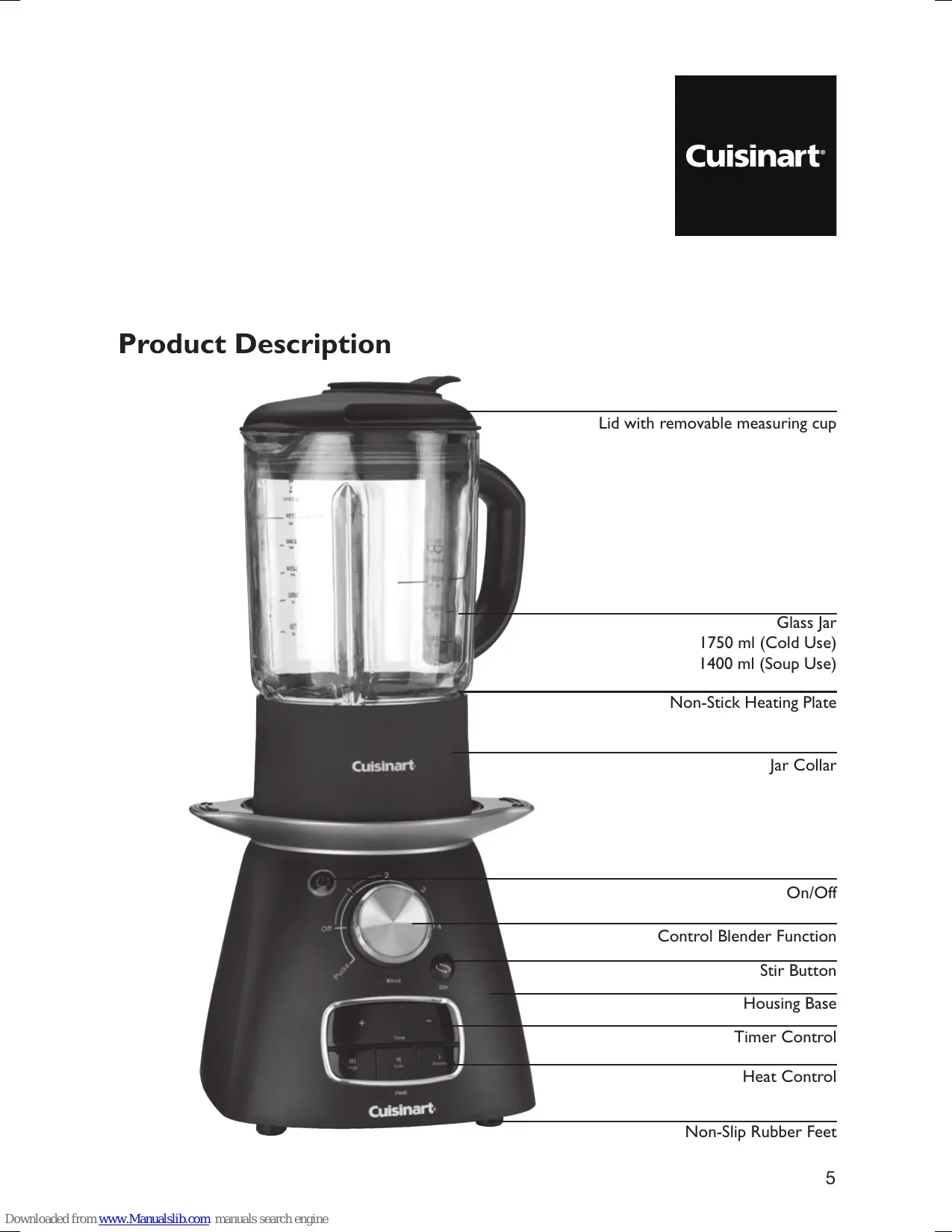 all packaging materials and any promotional labels or stickers are removed from the Soup Maker before first use. nA lways inspect the appliance before use for noticeable signs of damage. Do not use if damaged, or if the appliance has been dropped. In the event of damage, or if the appliance develops a fault, contact the Cuisinart Customer Care Line (See “UK After Sales Service” section). nD o not use this appliance if the lead is damaged. In the event of lead damage discontinue use immediately. If the lead is damaged it must be replaced with a special lead available from the manufacturer or its service agent (See “UK After Sales Service”). nW hilst in use the surfaces will become extremely hot. Do not touch hot surfaces. Always use handles. nU nplug from the mains when not in use and before cleaning. Allow to cool before cleaning the appliance. To disconnect, press On/Off button and then remove the plug from the mains. nT his appliance should not be used by adults or children whose lack of experience, product knowledge or disability might cause a hazard, unless they have been correctly instructed and are adequately supervised. nC hildren should always be supervised to ensure that they do not play with this product. nD o not use any accessories or attachments with this appliance other than those recommended by Cuisinart. nT o protect against fire, electric shock or personal injury, do not immerse cord, plug or unit in water or other liquids. n I f motor stalls, switch off and unplug from the mains. Leave for 30 seconds and switch plug and appliance back on. 6 Downloaded from www.Manualslib.com manuals search engine