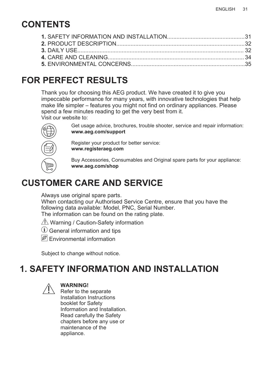 When contacting our Authorised Service Centre, ensure that you have the following data available: Model, PNC, Serial Number. The information can be found on the rating plate. Warning / Caution-Safety information General information and tips Environmental information Subject to change without notice.
