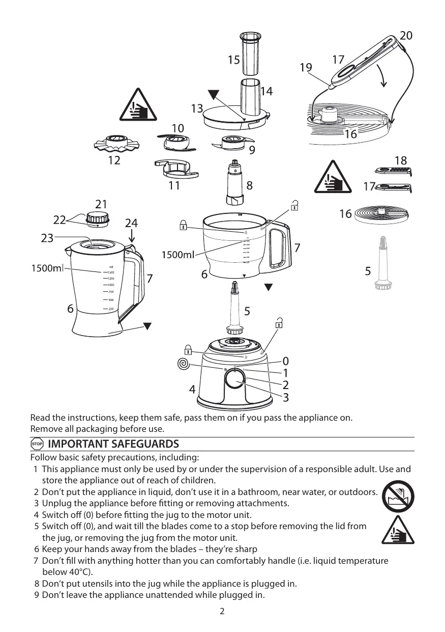1 This appliance must only be used by or under the supervision of a responsible adult. Use and store the appliance out of reach of children. 2 Don’t put the appliance in liquid, don’t use it in a bathroom, near water, or outdoors. 3 Unplug the appliance before fitting or removing attachments. 4 Switch off (0) before fitting the jug to the motor unit. 5 Switch off (0), and wait till the blades come to a stop before removing the lid from the jug, or removing the jug from the motor unit. 6 Keep your hands away from the blades – they’re sharp 7 Don’t fill with anything hotter than you can comfortably handle (i.e. liquid temperature below 40°C). 8 Don’t put utensils into the jug while the appliance is plugged in. 9 Don’t leave the appliance unattended while plugged in. 2