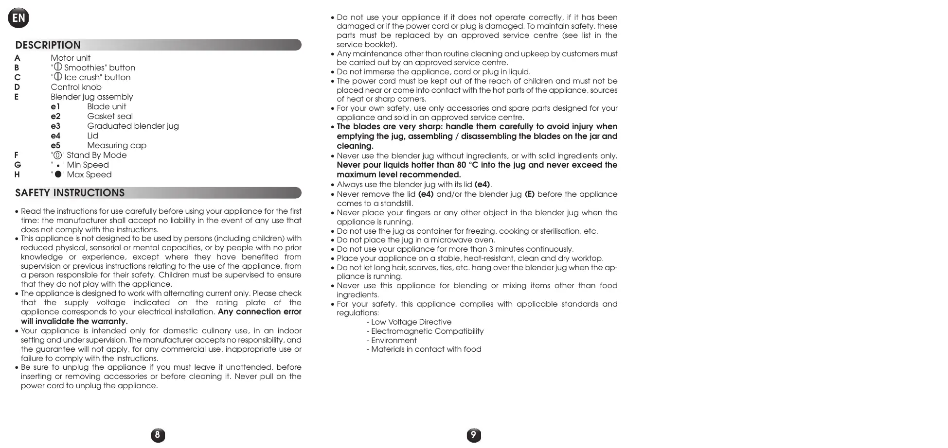 • Never place your fingers or any other object in the blender jug when the appliance is running. • Do not use the jug as container for freezing, cooking or sterilisation, etc. • Do not place the jug in a microwave oven. • Do not use your appliance for more than 3 minutes continuously. • Place your appliance on a stable, heat-resistant, clean and dry worktop. • Do not let long hair, scarves, ties, etc. hang over the blender jug when the appliance is running. • Never use this appliance for blending or mixing items other than food ingredients. • For your safety, this appliance complies with applicable standards and regulations: - Low Voltage Directive - Electromagnetic Compatibility - Environment - Materials in contact with food
