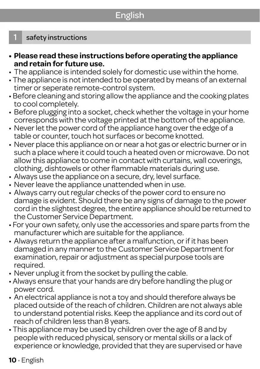 • Ne pas tirer sur le cordon électrique ni sur l’appareil lui-même pour retirer la fiche de la prise de courant murale. Ne jamais toucher l’appareil avec les mains mouillées ou humides. • Ne jamais laisser l’appareil à la portée des enfants. Les enfants ne sont pas conscients des dangers qui peuvent exister lors de l’utilisation d’appareils électriques. C’est pourquoi vous ne devez jamais laisser un enfant se servir de cet appareil sans surveillance. Veillez à ce que l’appareil soit toujours rangé de telle sorte que les enfants ne puissent pas y accéder. • L’appareil peut être utilisé par les enfants de plus de 8 ans ainsi que par les déficients physiques, sensoriels ou mentaux et les personnes ayant peu de connaissances ou d’expérience à la condition qu’ils soient surveillés ou sachent comment l’utiliser en toute sécurité et en comprennent les risques. • Les enfants ne doivent pas jouer avec l’appareil. • Le nettoyage et l’entretien ne doivent pas être effectués par des enfants sans surveillance. • Vous ne pouvez utiliser une rallonge électrique que si le voltage et la puissance sont les mêmes (voir plaque technique) ou plus élevés que ceux du cordon livré avec l’appareil. Utilisez toujours une rallonge de cordon électrique de terre qui soit conforme aux normes de sécurité. • Si vous décidez de ne plus utiliser l’appareil en raison d’une panne ou d’une défectuosité, nous vous conseillons alors, une fois après avoir retiré la fiche de la prise de courant murale, de couper le cordon électrique. Emportez l’appareil au service correspondant de votre commune. • Si l’appareil, une fois mis en marche, ne fonctionne pas, il se peut alors que cela vienne du fusible ou du disjoncteur miniature dans la boîte de répartition électrique. Le groupe est peut-être trop chargé ou bien il y a eu du courant de fuite de terre. • En cas de perturbation ou de panne, n’essayez jamais de réparer vous-même l’appareil; si la sécurité de l’appareil a sauté, cela peut vouloir indiquer une défectuosité, et ceci ne peut pas se réparer en enlevant ou en remplaçant cette sécurité. Il est indispensable d’utiliser exclusivement des pièces détachées d’origine. • Ne plongez jamais l’appareil, le cordon électrique ou la fiche de l’appareil dans de l’eau ou dans tout autre liquide. • Ce appareil a été conçu uniquement pour un usage domestique. Si cet appareil a été utilisé d’une manière abusive, il ne pourra être question de dommages et intérêts en cas de panne, et tout droit de garantie sera annulé. Français • 21