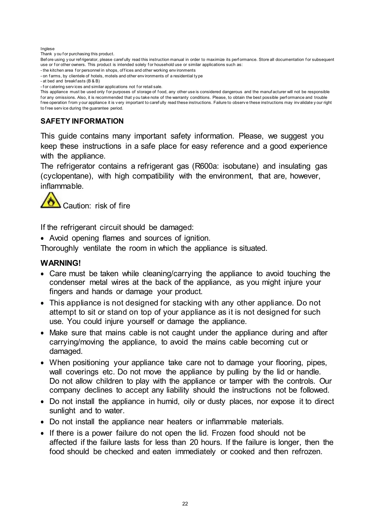 The refrigerator contains a refrigerant gas (R600a: isobutane) and insulating gas (cyclopentane), with high compatibility with the environment, that are, however, inflammable. Caution: risk of fire If the refrigerant circuit should be damaged: • Avoid opening flames and sources of ignition. Thoroughly ventilate the room in which the appliance is situated. WARNING! • Care must be taken while cleaning/carrying the appliance to avoid touching the condenser metal wires at the back of the appliance, as you might injure your fingers and hands or damage your product. • This appliance is not designed for stacking with any other appliance. Do not attempt to sit or stand on top of your appliance as it is not designed for such use. You could injure yourself or damage the appliance. • Make sure that mains cable is not caught under the appliance during and after carrying/moving the appliance, to avoid the mains cable becoming cut or damaged. • When positioning your appliance take care not to damage your flooring, pipes, wall coverings etc. Do not move the appliance by pulling by the lid or handle. Do not allow children to play with the appliance or tamper with the controls. Our company declines to accept any liability should the instructions not be followed. • Do not install the appliance in humid, oily or dusty places, nor expose it to direct sunlight and to water. • Do not install the appliance near heaters or inflammable materials. • If there is a power failure do not open the lid. Frozen food should not be affected if the failure lasts for less than 20 hours. If the failure is longer, then the food should be checked and eaten immediately or cooked and then refrozen.