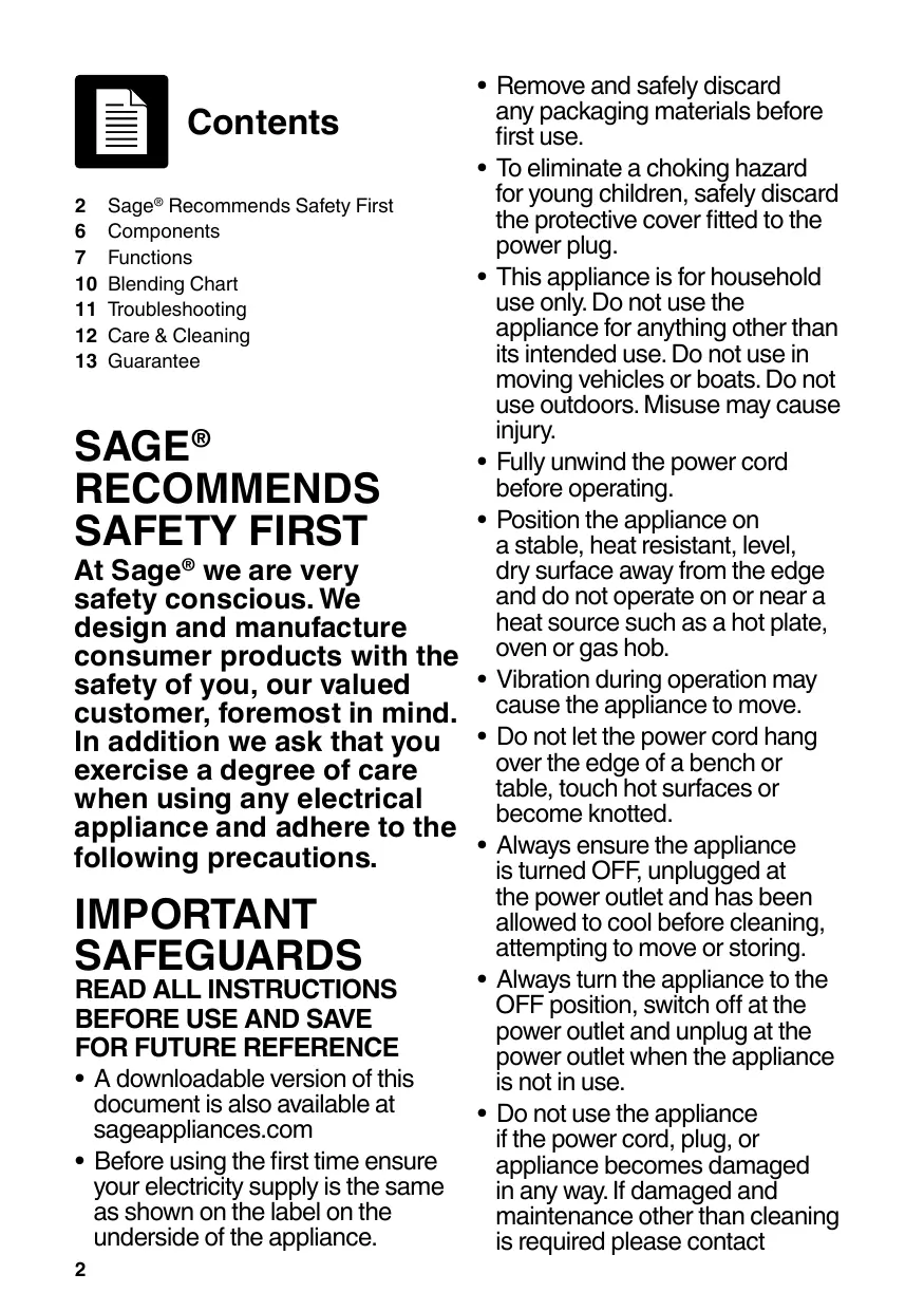 At Sage® we are very safety conscious. We design and manufacture consumer products with the safety of you, our valued customer, foremost in mind. In addition we ask that you exercise a degree of care when using any electrical appliance and adhere to the following precautions.