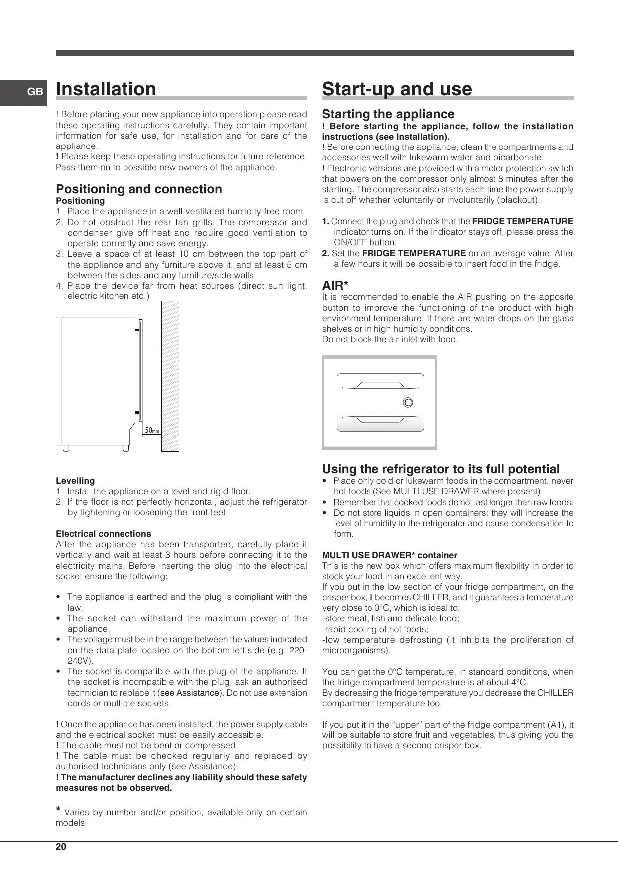 • Remember that cooked foods do not last longer than raw foods. • Do not store liquids in open containers: they will increase the level of humidity in the refrigerator and cause condensation to form. MULTI USE DRAWER* container This is the new box which offers maximum flexibility in order to stock your food in an excellent way. If you put in the low section of your fridge compartment, on the crisper box, it becomes CHILLER, and it guarantees a temperature very close to 0°C, which is ideal to: -store meat, fish and delicate food; -rapid cooling of hot foods; -low temperature defrosting (it inhibits the proliferation of microorganisms). You can get the 0°C temperature, in standard conditions, when the fridge compartment temperature is at about 4°C. By decreasing the fridge temperature you decrease the CHILLER compartment temperature too. If you put it in the “upper” part of the fridge compartment (A1), it will be suitable to store fruit and vegetables, thus giving you the possibility to have a second crisper box.