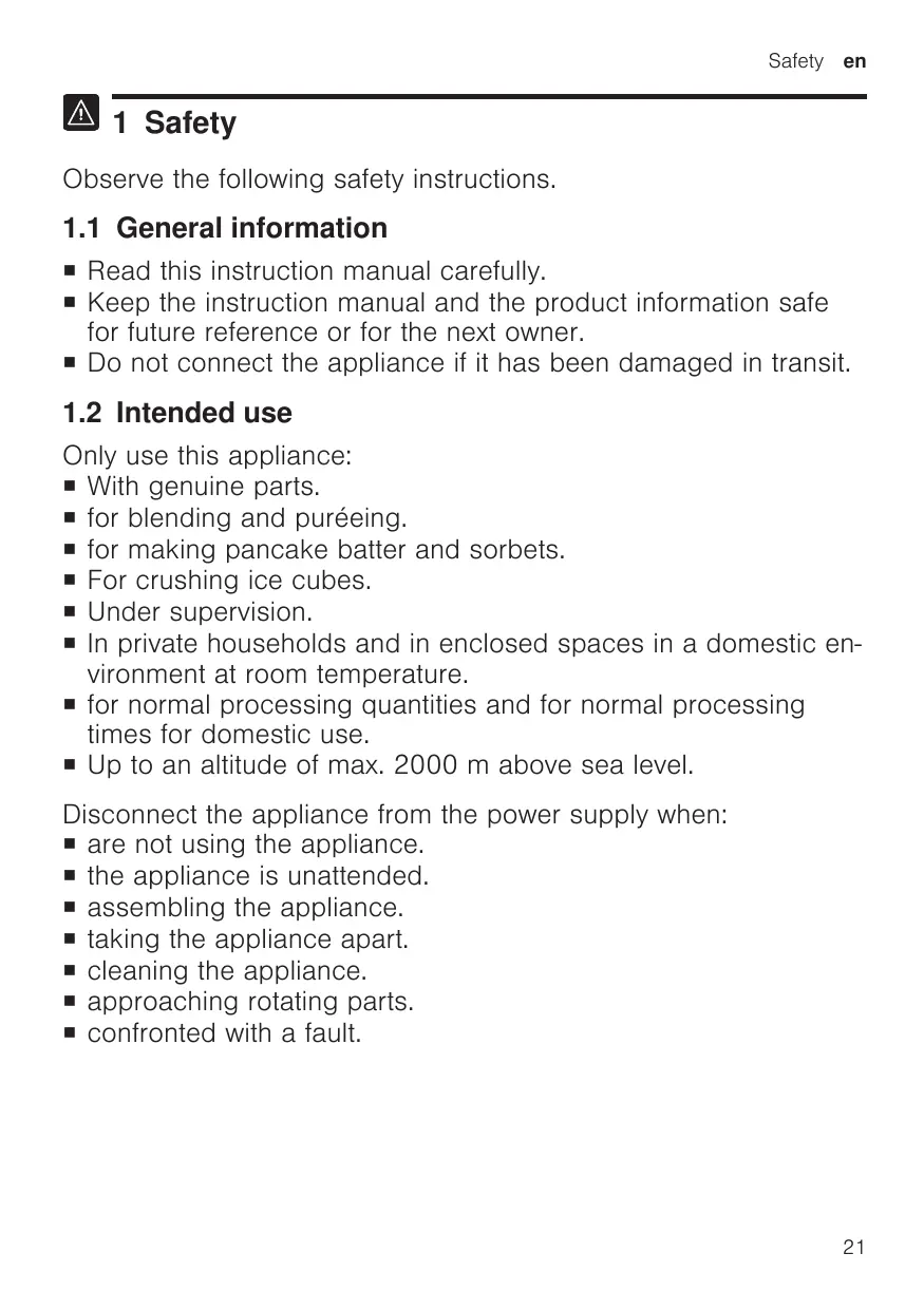 Only use this appliance: ¡ With genuine parts. ¡ for blending and puréeing. ¡ for making pancake batter and sorbets. ¡ For crushing ice cubes. ¡ Under supervision. ¡ In private households and in enclosed spaces in a domestic environment at room temperature. ¡ for normal processing quantities and for normal processing times for domestic use. ¡ Up to an altitude of max. 2000 m above sea level. Disconnect the appliance from the power supply when: ¡ are not using the appliance. ¡ the appliance is unattended. ¡ assembling the appliance. ¡ taking the appliance apart. ¡ cleaning the appliance. ¡ approaching rotating parts. ¡ confronted with a fault.