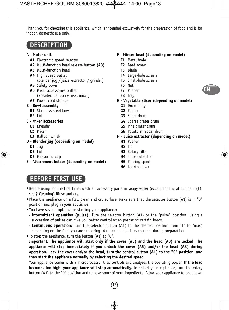 • Before using for the first time, wash all accessory parts in soapy water (except for the attachment (E): see § Cleaning) Rinse and dry. • Place the appliance on a flat, clean and dry surface. Make sure that the selector button (A1) is in "0" position and plug in your appliance. • You have several options for starting your appliance: - Intermittent operation (pulse): Turn the selector button (A1) to the "pulse" position. Using a succession of pulses can give you better control when preparing certain foods. - Continuous operation: Turn the selector button (A1) to the desired position from "1" to "max" depending on the food you are preparing. You can change it as required during preparation. • To stop the appliance, turn the button (A1) to "0". Important: The appliance will start only if the cover (A5) and the head (A3) are locked. The appliance will stop immediately if you unlock the cover (A5) and/or the head (A3) during operation. Lock the cover and/or the head, turn the control button (A1) to the "0" position, and then start the appliance normally by selecting the desired speed. Your appliance comes with a microprocessor that controls and analyses the operating power. If the load becomes too high, your appliance will stop automatically. To restart your appliance, turn the rotary button (A1) to the "0" position and remove some of your ingredients. Allow your appliance to cool down 13