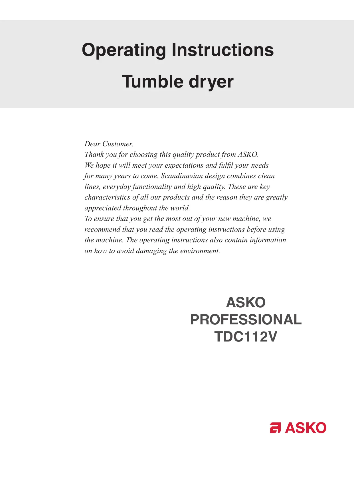 Operating Instructions Tumble dryer Dear Customer, Thank you for choosing this quality product from ASKO. We hope it will meet your expectations and fulfil your needs for many years to come. Scandinavian design combines clean lines, everyday functionality and high quality. These are key characteristics of all our products and the reason they are greatly appreciated throughout the world. To ensure that you get the most out of your new machine, we recommend that you read the operating instructions before using the machine. The operating instructions also contain information on how to avoid damaging the environment. ASKO PROFESSIONAL TDC112V Contents Before using your machine for the first time  Language selection  Laundry labels  Safety instructions  Safety  Installation  Packing material  Recycling  Child safety  General  Child-safe start  Activating/deactivating Child-safe  start.  Description of the tumble dryer  Advice and tips before you tumble-dry  Materials that can be tumble-dried  Materials that must not be tumble-dried  Static electricity  Tumble drying  Sort your fabrics  Select the programme  Press the Start button  Drying programme finished