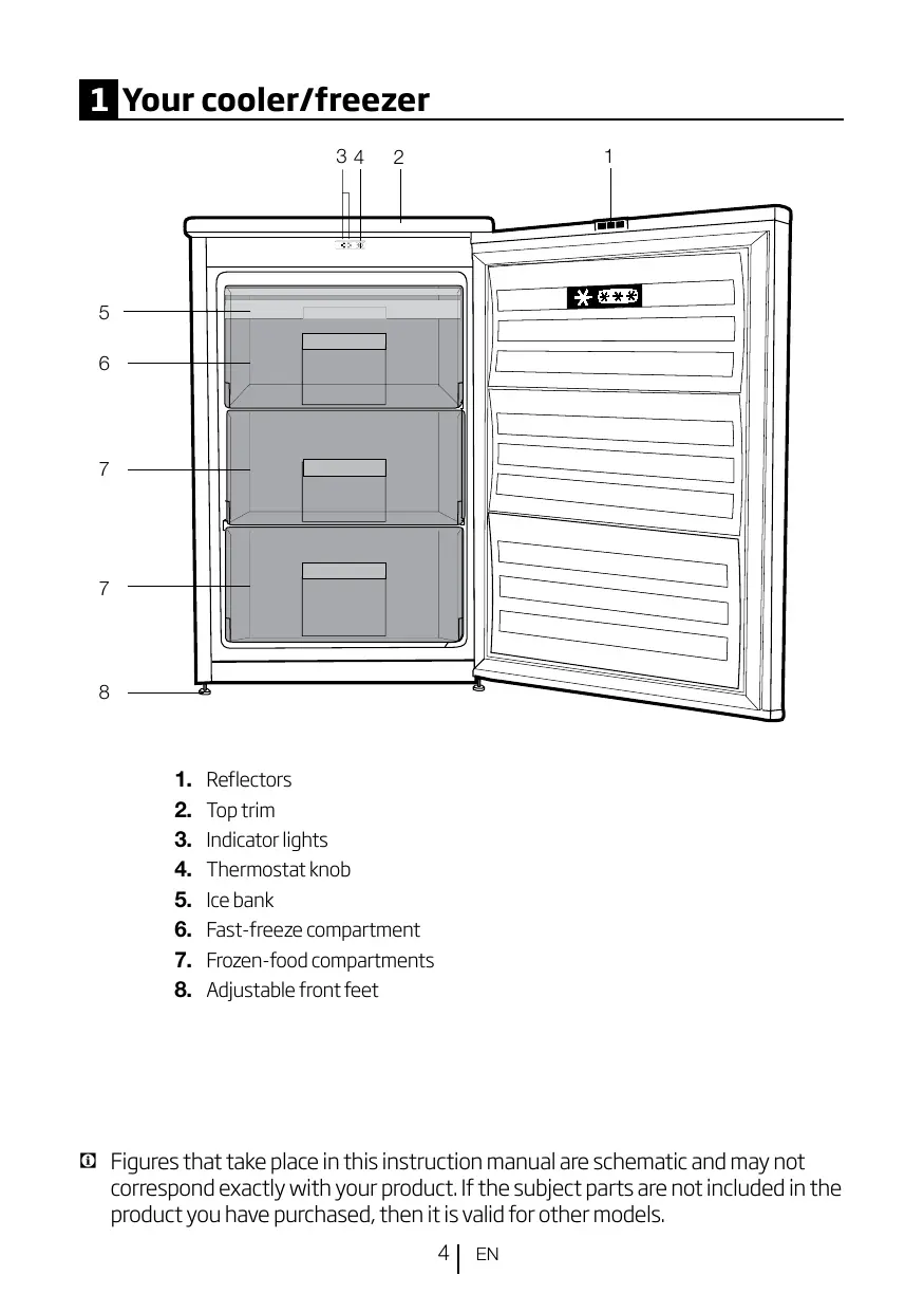 Properly securing adjustable legs on the floor can prevent the cooler/freezer to move. t When carrying the cooler/ freezer, do not hold it from door handle. Otherwise, it may be snapped. t When you have to place your product next to another cooler/freezer or freezer, the distance between devices should be at least 8cm. Otherwise, adjacent side walls may be humidified. t The product shall never be used while the compartment which is located at the top or back of your product and in which electronic boards are available (electronic board box cover) (1) is open. t Electrical safety of your cooler/ freezer shall be guaranteed only if the earth system in your house complies with standards. t The voltage stated on the label located at left inner side of your product should be equal to your network voltage. t Extension cables and multi plugs must not be used for connection.
