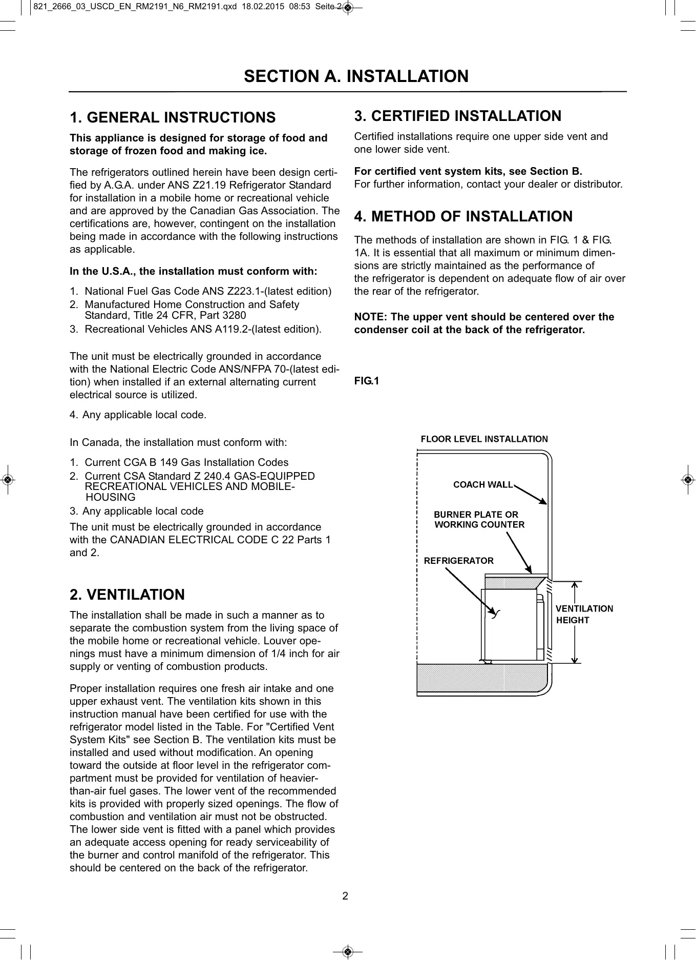 2. VENTILATION The installation shall be made in such a manner as to separate the combustion system from the living space of the mobile home or recreational vehicle. Louver openings must have a minimum dimension of 1/4 inch for air supply or venting of combustion products. Proper installation requires one fresh air intake and one upper exhaust vent. The ventilation kits shown in this instruction manual have been certified for use with the refrigerator model listed in the Table. For "Certified Vent System Kits" see Section B. The ventilation kits must be installed and used without modification. An opening toward the outside at floor level in the refrigerator compartment must be provided for ventilation of heavierthan-air fuel gases. The lower vent of the recommended kits is provided with properly sized openings. The flow of combustion and ventilation air must not be obstructed. The lower side vent is fitted with a panel which provides an adequate access opening for ready serviceability of the burner and control manifold of the refrigerator. This should be centered on the back of the refrigerator. 2