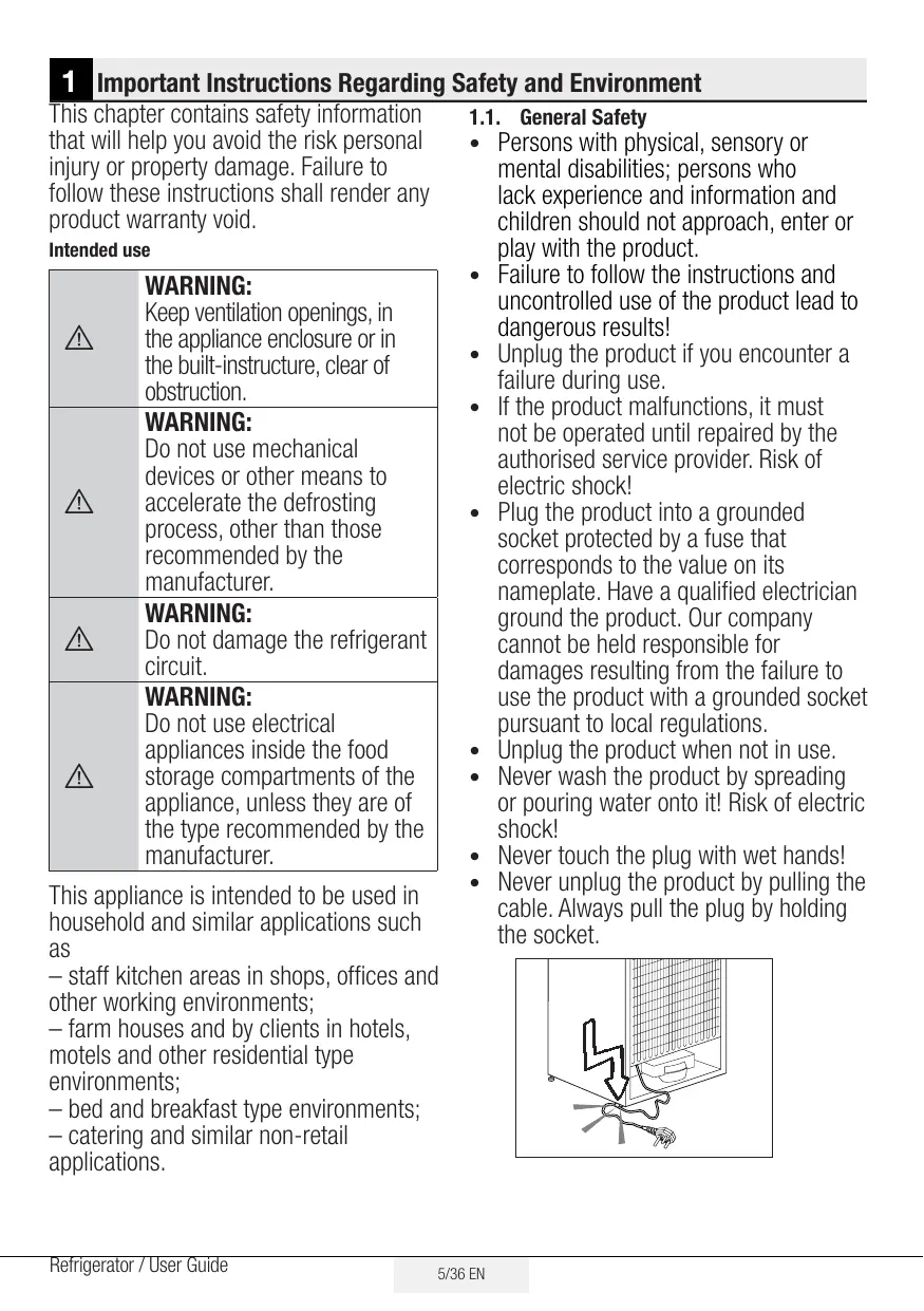 - Pour être utilisé par les clients dans les maisons de campagne et hôtels et les autres environnements d’hébergement ; - Dans des environnements de type de Utilisation Préconisée pension de famille AVERTISSEMENT: - Dans des applications similaires Assurez-vous que les trous n’ayant pas de service alimentaire et non d’aération ne sont pas détaillants fermés quand le dispositif 1.1. Sécurité générale est dans son boîtier ou est • Les personnes présentant un handicap installé à sa place. physique, sensoriel ou mental ou encore celles manquant d’expérience AVERTISSEMENT: ou de connaissances appropriées, ou Ne pas utiliser tout les enfants doivent éviter d’utiliser, de dispositif mécanique ou se rapprocher, de jouer ou de rentrer à un autre dispositif hors l’intérieur de ce produit. des recommandations du • L’utilisation non contrôlée et le nonfabricant pour accélérer le respect des consignes énoncées ciprocessus de décongeler. dessus constituent un réel danger ! AVERTISSEMENT: • Débranchez l’appareil si une panne Ne pas endommager survient alors qu'il est en cours le circuit de fluide du d’utilisation. réfrigérateur. • En cas de dysfonctionnement, n’utilisez AVERTISSEMENT: pas l’appareil jusqu’à ce qu’il soit Ne pas utiliser des appareils réparé par un agent de service agréé. électriques non prévus Risque de choc électrique ! par le fabricant dans • Branchez l’appareil à une prise mise les compartiments de à la terre, protégée par un fusible conservation des aliments. conforme aux valeurs figurant sur la AVERTISSEMENT: plaque signalétique. Faites appel à un Ne conservez pas de électricien qualifié pour la mise à la substances explosives terre de l’appareil. Notre société ne comme des aérosols avec peut pas être tenue pour responsable un liquide inflammable dans des dommages résultant de la non cet appareil. utilisation du produit avec une prise mise à la terre conformément aux Ce dispositif est conçu pour l’usage réglementations locales. domestique ou les applications similaires • Débranchez l'appareil lorsque vous ne suivantes : l'utilisez pas.