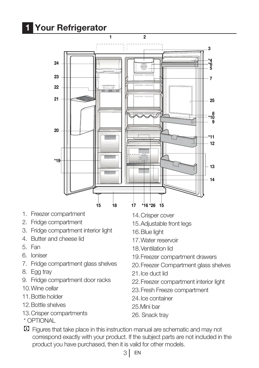 1. Freezer compartment 14. Crisper cover 2. Fridge compartment 15. Adjustable front legs 3. Fridge compartment interior light 16. Blue light 4. Butter and cheese lid 17. Water reservoir 5. Fan 18. Ventilation lid 6. Ioniser 19. Freezer compartment drawers 7. Fridge compartment glass shelves 20. Freezer Compartment glass shelves 8. Egg tray 21. Ice duct lid 9. Fridge compartment door racks 22. Freezer compartment interior light 10. Wine cellar 23. Fresh Freeze compartment 11. Bottle holder 24. Ice container 12. Bottle shelves 25.Mini bar 13. Crisper compartments 26. Snack tray * OPTIONAL C Figures that take place in this instruction manual are schematic and may not correspond exactly with your product. If the subject parts are not included in the product you have purchased, then it is valid for other models. 3 EN
