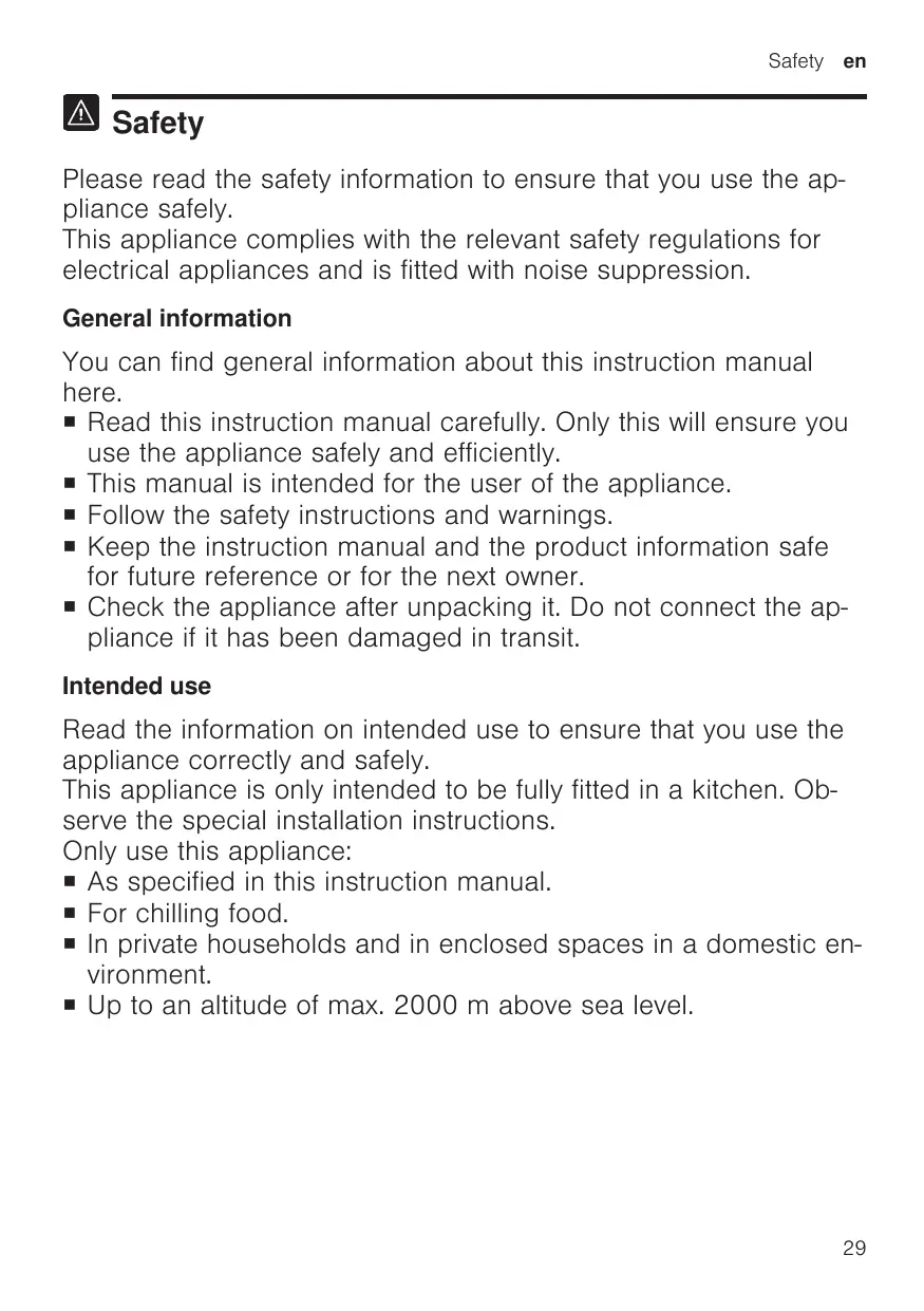 Table of contents Safety 29 General information 29 Intended use 29 Restriction on user group 30 Safe transport 30 Safe installation 30 Safe use 31 Damaged appliance 33