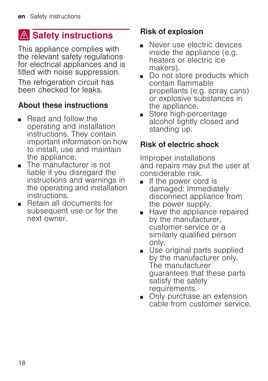 en Safety instructions ( Safety instructions This appliance complies with the relevant safety regulations for electrical appliances and is fitted with noise suppression. The refrigeration circuit has been checked for leaks. Risk of explosion