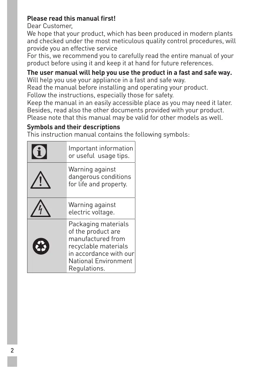 Please read this manual first! Dear Customer, We hope that your product, which has been produced in modern plants and checked under the most meticulous quality control procedures, will provide you an effective service For this, we recommend you to carefully read the entire manual of your product before using it and keep it at hand for future references. The user manual will help you use the product in a fast and safe way. Will help you use your appliance in a fast and safe way. Read the manual before installing and operating your product. Follow the instructions, especially those for safety. Keep the manual in an easily accessible place as you may need it later. Besides, read also the other documents provided with your product. Please note that this manual may be valid for other models as well. Symbols and their descriptions This instruction manual contains the following symbols: