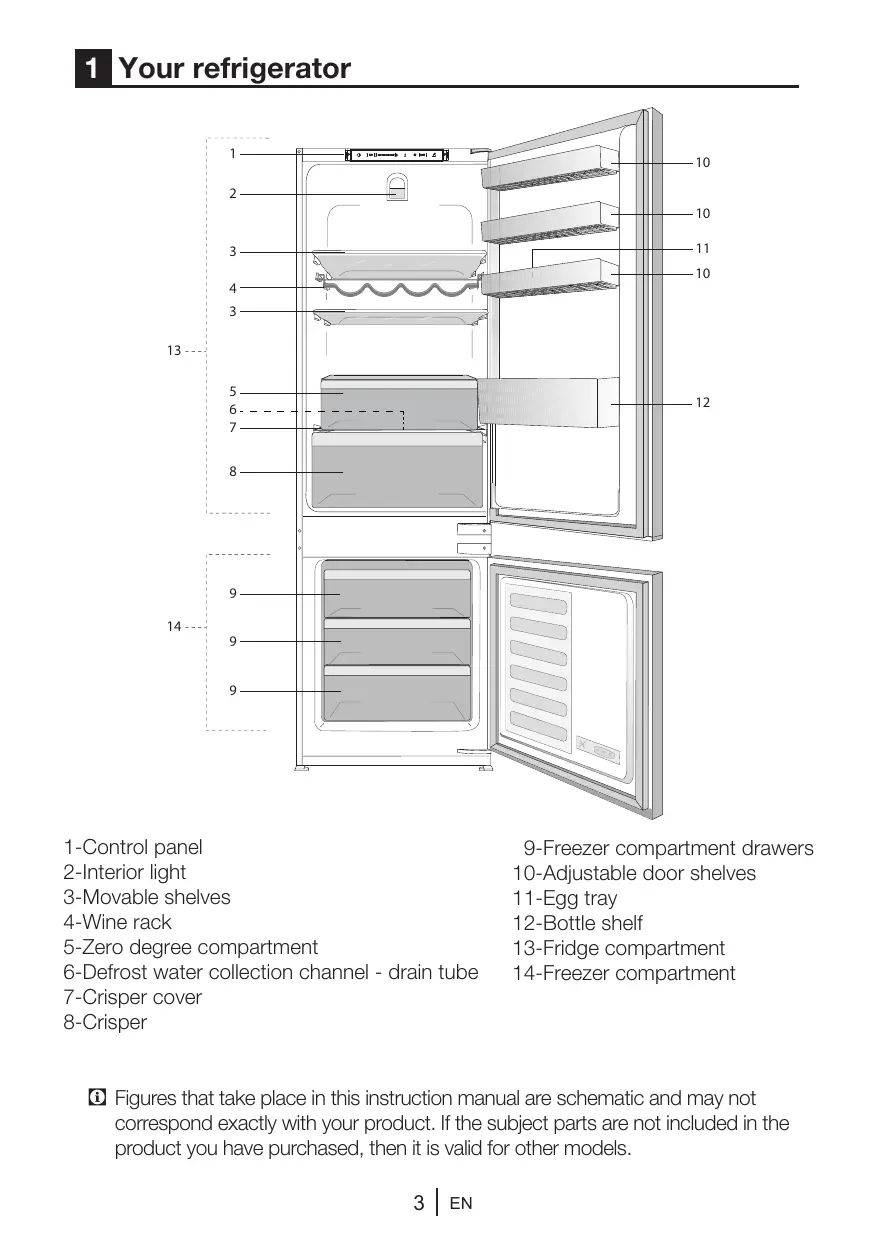 9-Freezer compartment dra ers 10-Adjustable door shelves 11-Egg tray 12-Bottle shelf 13-Fridge compartment 14-Freezer compartment