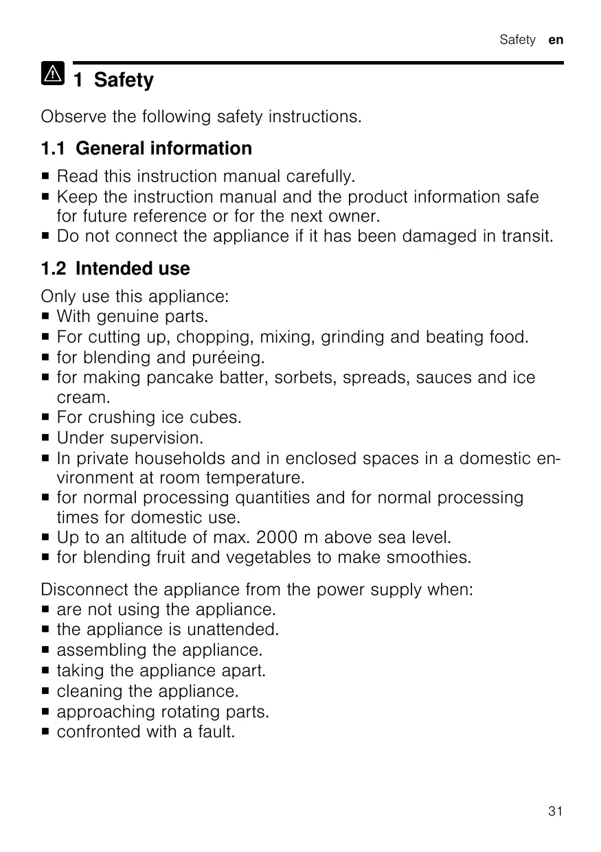 Only use this appliance: ¡ With genuine parts. ¡ For cutting up, chopping, mixing, grinding and beating food. ¡ for blending and puréeing. ¡ for making pancake batter, sorbets, spreads, sauces and ice cream. ¡ For crushing ice cubes. ¡ Under supervision. ¡ In private households and in enclosed spaces in a domestic environment at room temperature. ¡ for normal processing quantities and for normal processing times for domestic use. ¡ Up to an altitude of max. 2000 m above sea level. ¡ for blending fruit and vegetables to make smoothies. Disconnect the appliance from the power supply when: ¡ are not using the appliance. ¡ the appliance is unattended. ¡ assembling the appliance. ¡ taking the appliance apart. ¡ cleaning the appliance. ¡ approaching rotating parts. ¡ confronted with a fault.