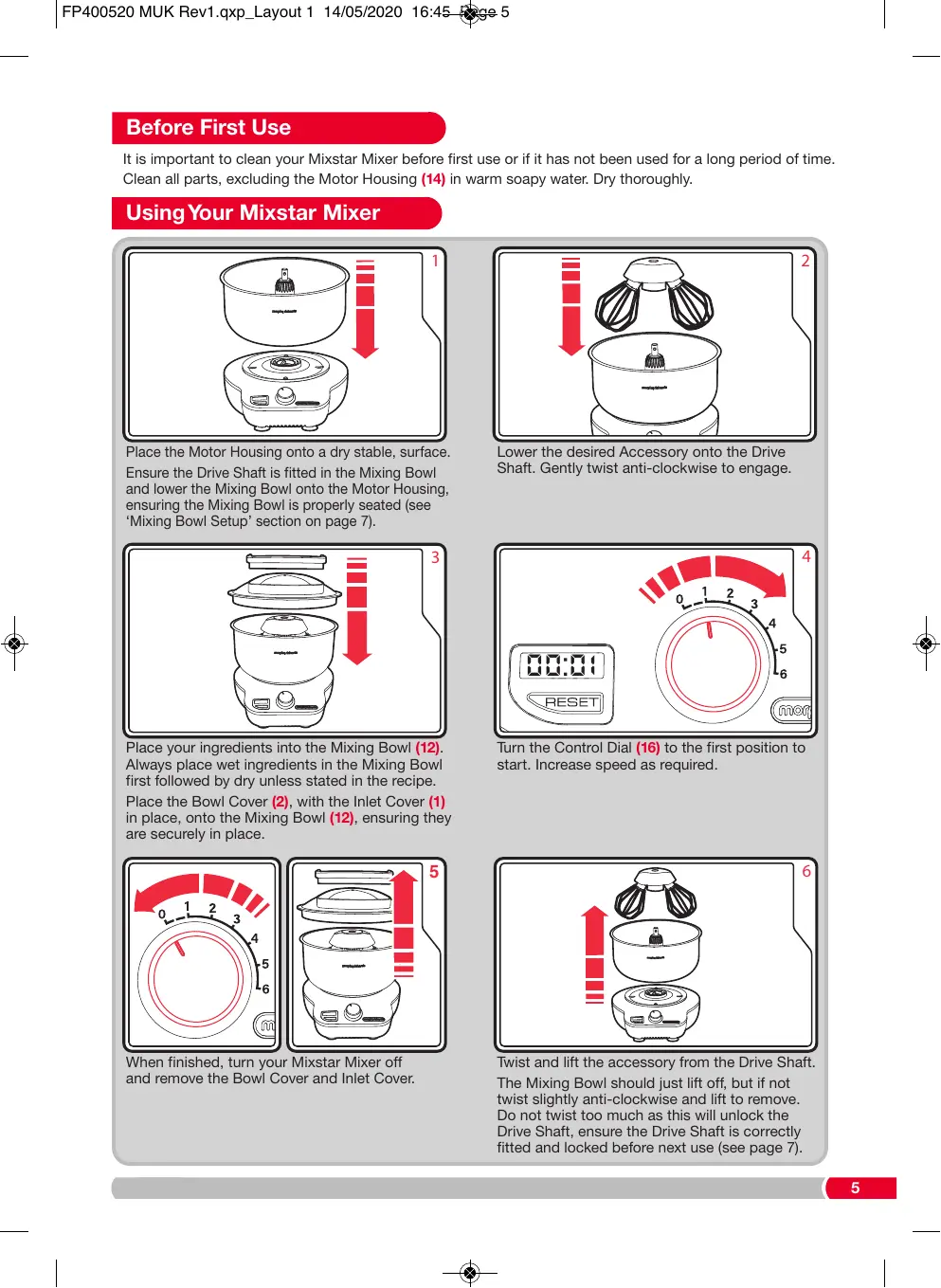 Before First Use It is important to clean your Mixstar Mixer before first use or if it has not been used for a long period of time. Clean all parts, excluding the Motor Housing (14) in warm soapy water. Dry thoroughly.