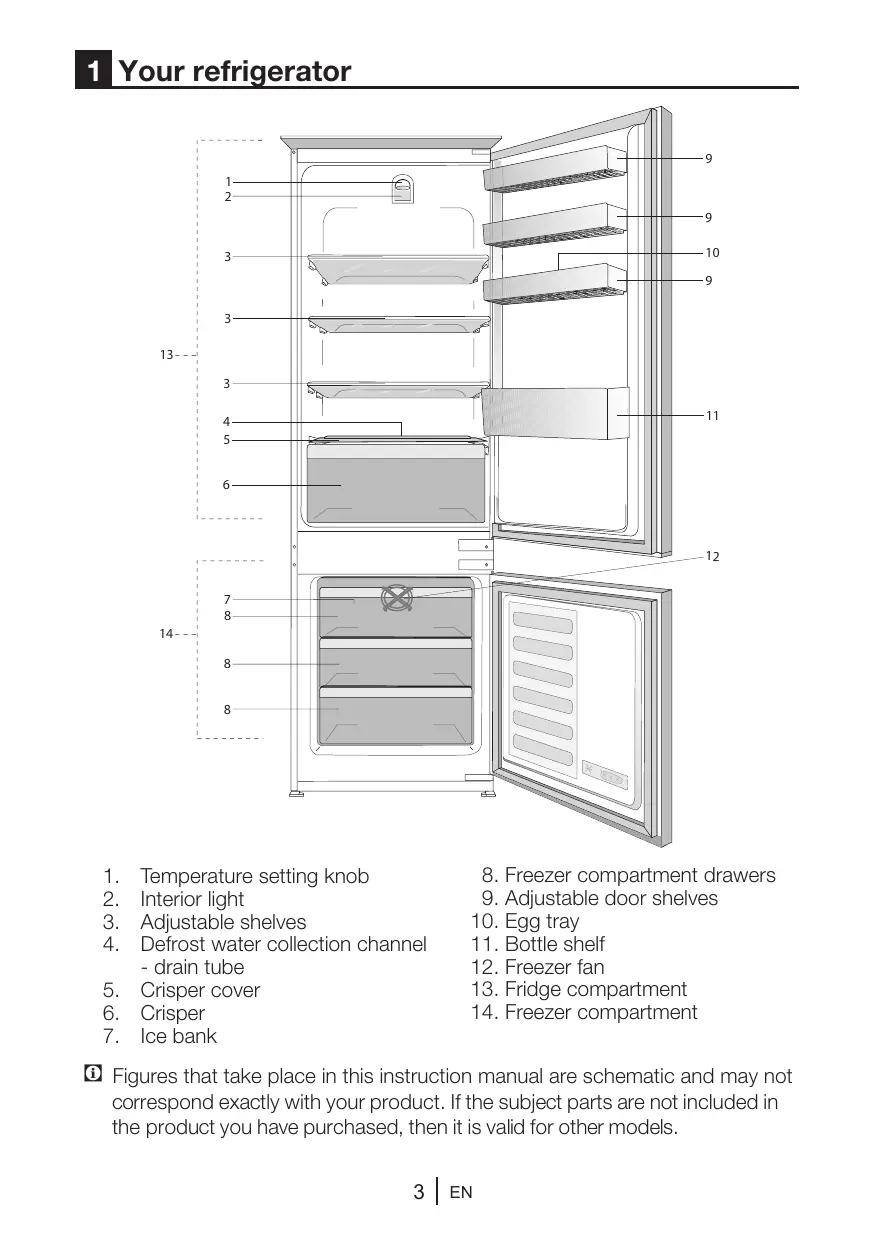 8. Freezer compartment drawers 9. Adjustable door shelves 10. Egg tray 11. Bottle shelf 12. Freezer fan 13. Fridge compartment 14. Freezer compartment