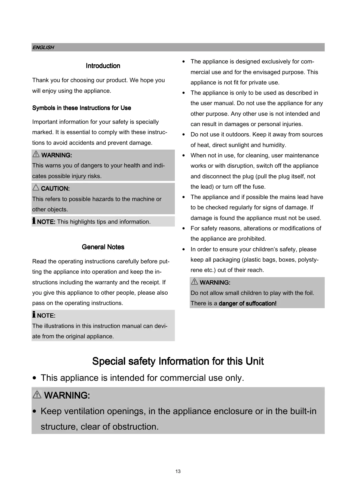 • This appliance is intended for commercial use only.