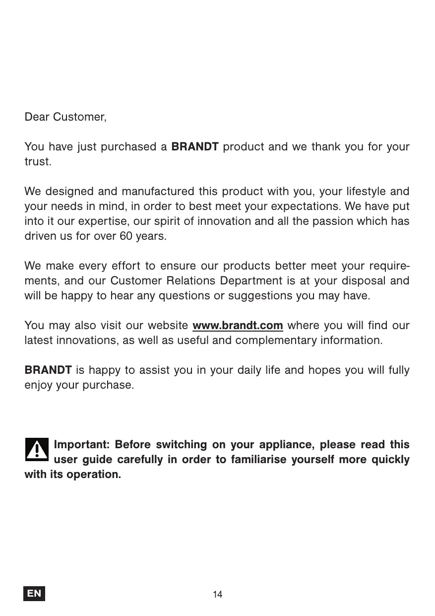 You have just purchased a BRANDT product and we thank you for your trust. We designed and manufactured this product with you, your lifestyle and your needs in mind, in order to best meet your expectations. We have put into it our expertise, our spirit of innovation and all the passion which has driven us for over 60 years. We make every effort to ensure our products better meet your requirements, and our Customer Relations Department is at your disposal and will be happy to hear any questions or suggestions you may have. You may also visit our website www.brandt.com where you will find our latest innovations, as well as useful and complementary information. BRANDT is happy to assist you in your daily life and hopes you will fully enjoy your purchase. Important: Before switching on your appliance, please read this user guide carefully in order to familiarise yourself more quickly with its operation.