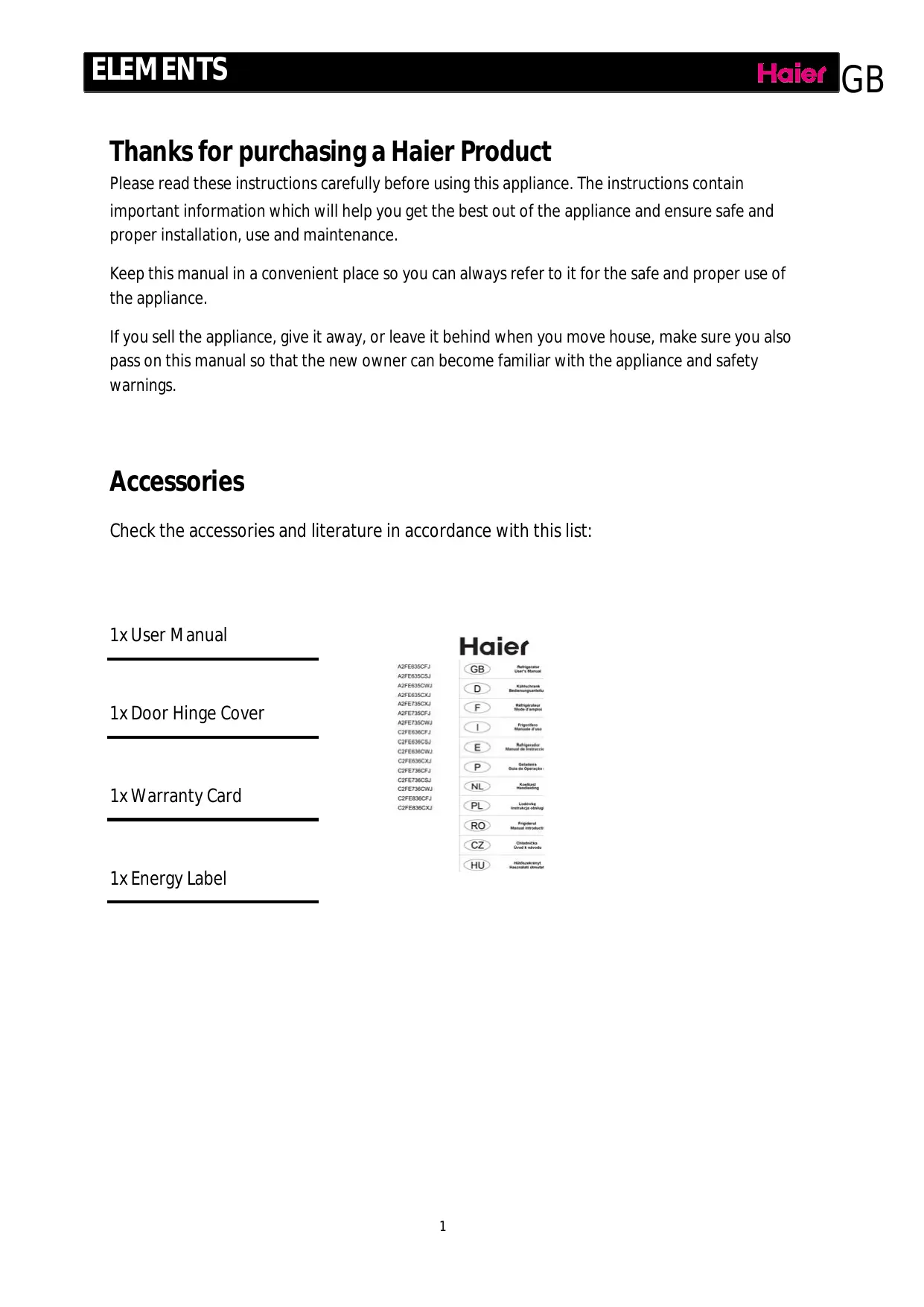 Thanks for purchasing a Haier Product Please read these instructions carefully before using this appliance. The instructions contain important information which will help you get the best out of the appliance and ensure safe and proper installation, use and maintenance. Keep this manual in a convenient place so you can always refer to it for the safe and proper use of the appliance. If you sell the appliance, give it away, or leave it behind when you move house, make sure you also pass on this manual so that the new owner can become familiar with the appliance and safety warnings.