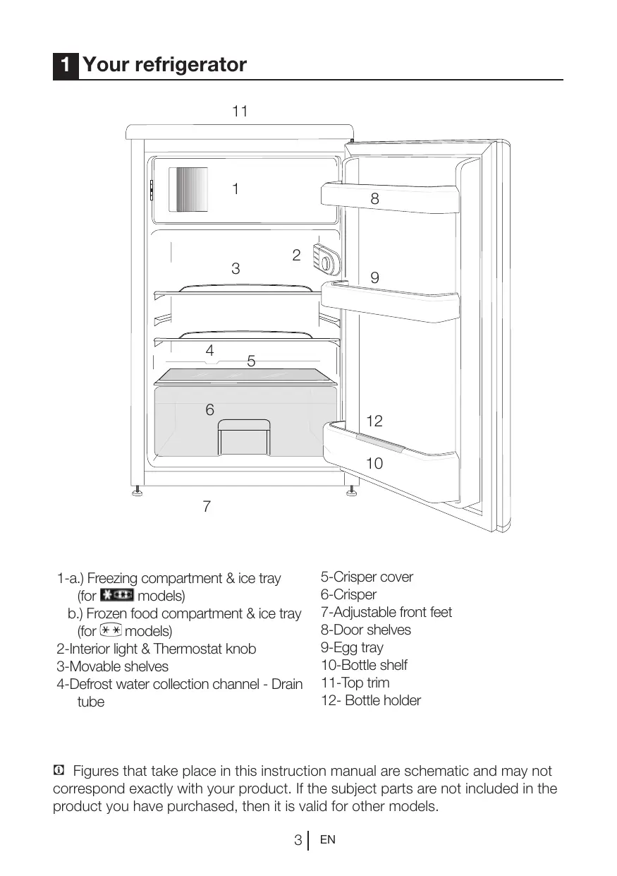 La disponibilité des pièces de rechange du réfrigérateur que vous avez acheté est de 10 ans. P endant cette période, des pièces de rechange originales seront disponibles pour faire fonctionner correctement le réfrigérateur. La durée minimale de garantie du réfrigérateur que vous avez acheté est de 24 mois. Cet appareil est doté d’une source d’éclairage de classe énergétique “G”. Seuls des réparateurs qualifiés sont autorisés à procéder au remplacement de la source d’éclairage de cet appareil.