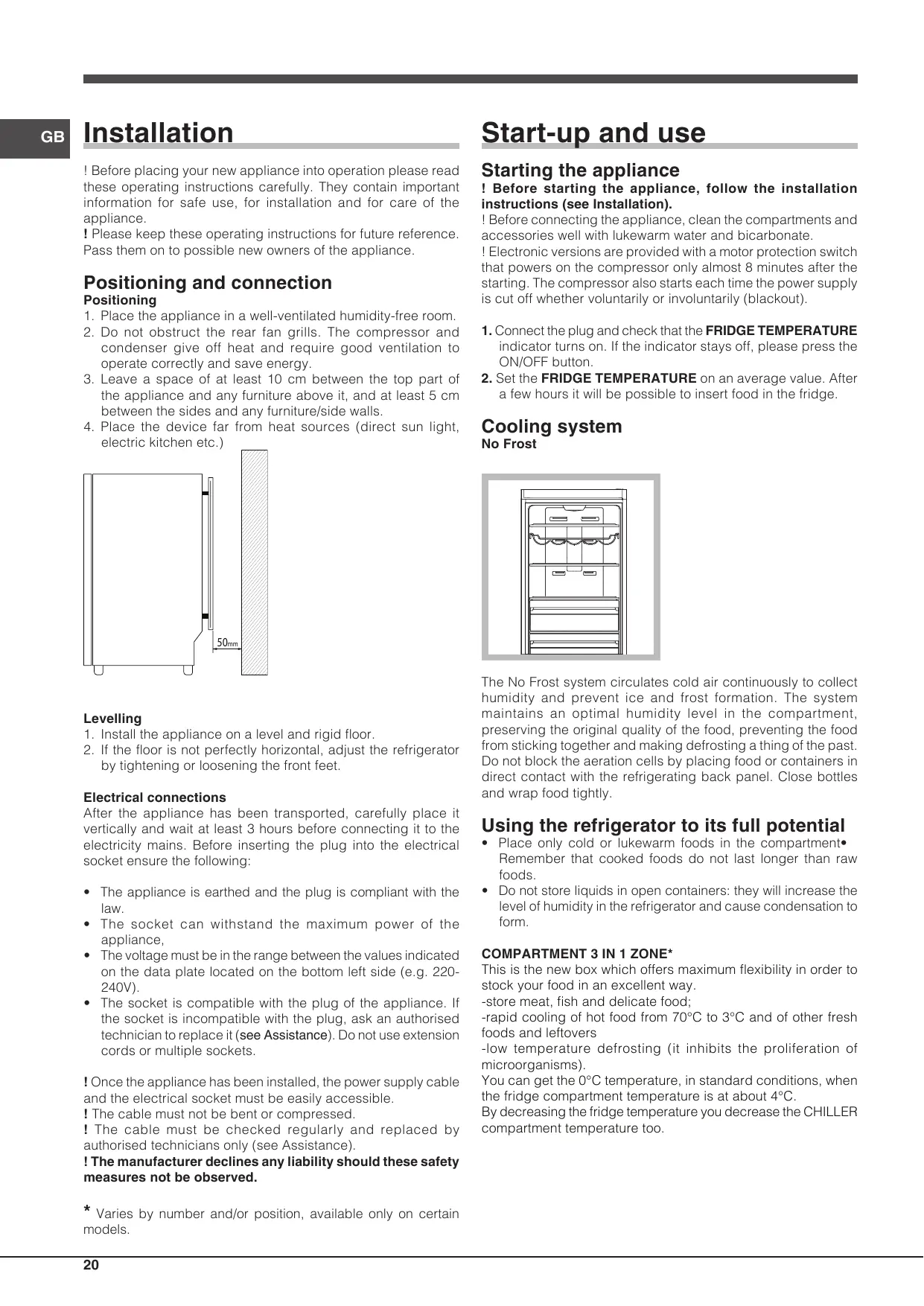 1. Install the appliance on a level and rigid floor. 2. If the floor is not perfectly horizontal, adjust the refrigerator by tightening or loosening the front feet. Electrical connections After the appliance has been transported, carefully place it vertically and wait at least 3 hours before connecting it to the electricity mains. Before inserting the plug into the electrical socket ensure the following: • The appliance is earthed and the plug is compliant with the law. • The socket can withstand the maximum power of the appliance, • The voltage must be in the range between the values indicated on the data plate located on the bottom left side (e.g. 220240V). • The socket is compatible with the plug of the appliance. If the socket is incompatible with the plug, ask an authorised technician to replace it (see Assistance). Do not use extension cords or multiple sockets. ! Once the appliance has been installed, the power supply cable and the electrical socket must be easily accessible. ! The cable must not be bent or compressed. ! The cable must be checked regularly and replaced by authorised technicians only (see Assistance). ! The manufacturer declines any liability should these safety measures not be observed.