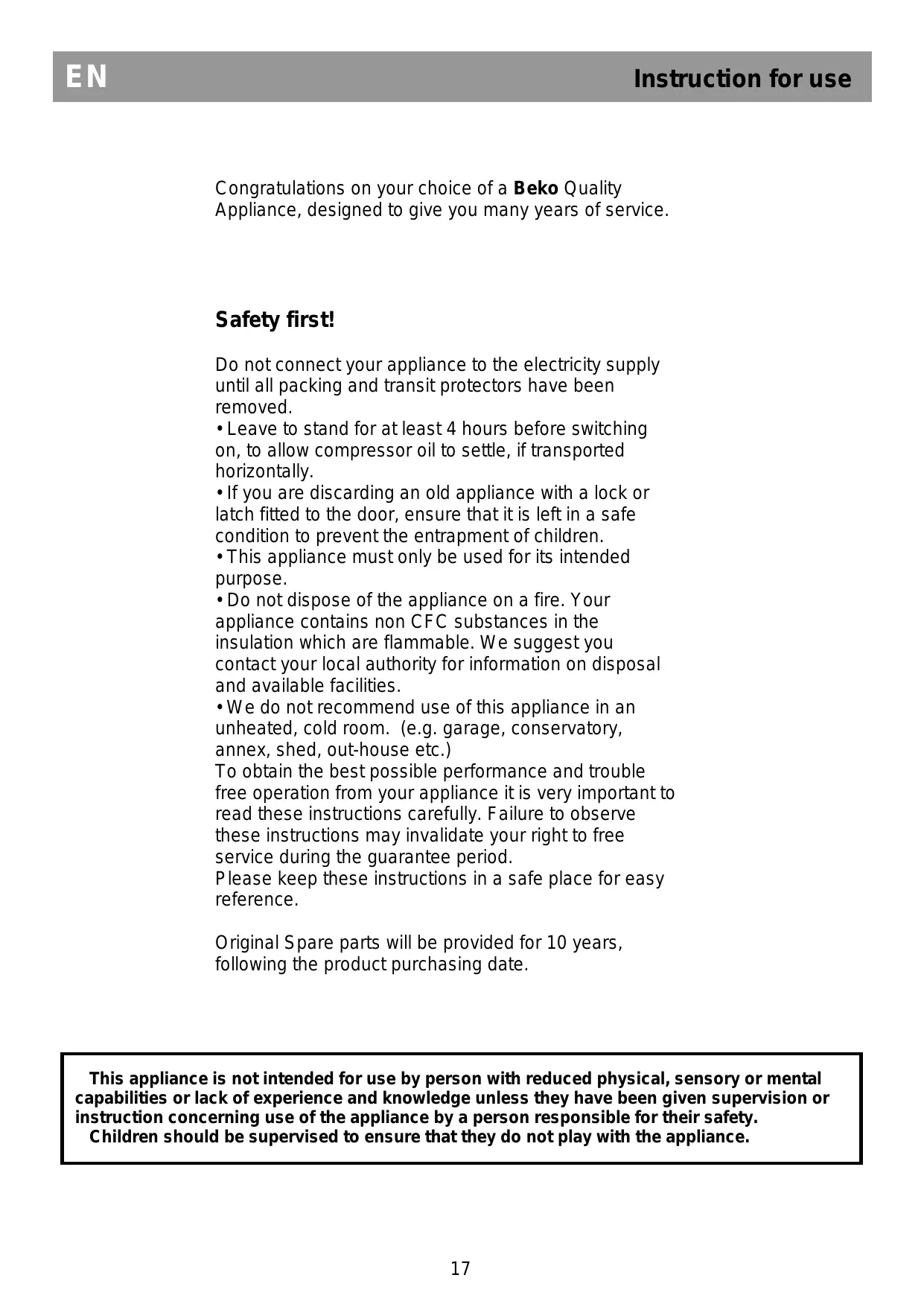 Cet appareil ne sera pas utilisé par des personnes ayant capacites physiques, sensorielles ou mentales réduites, ou sans experience concernant l'utilisation de l'appareil, si une personne responsable de leur sécurité ne les a pas instruites pour ce but.