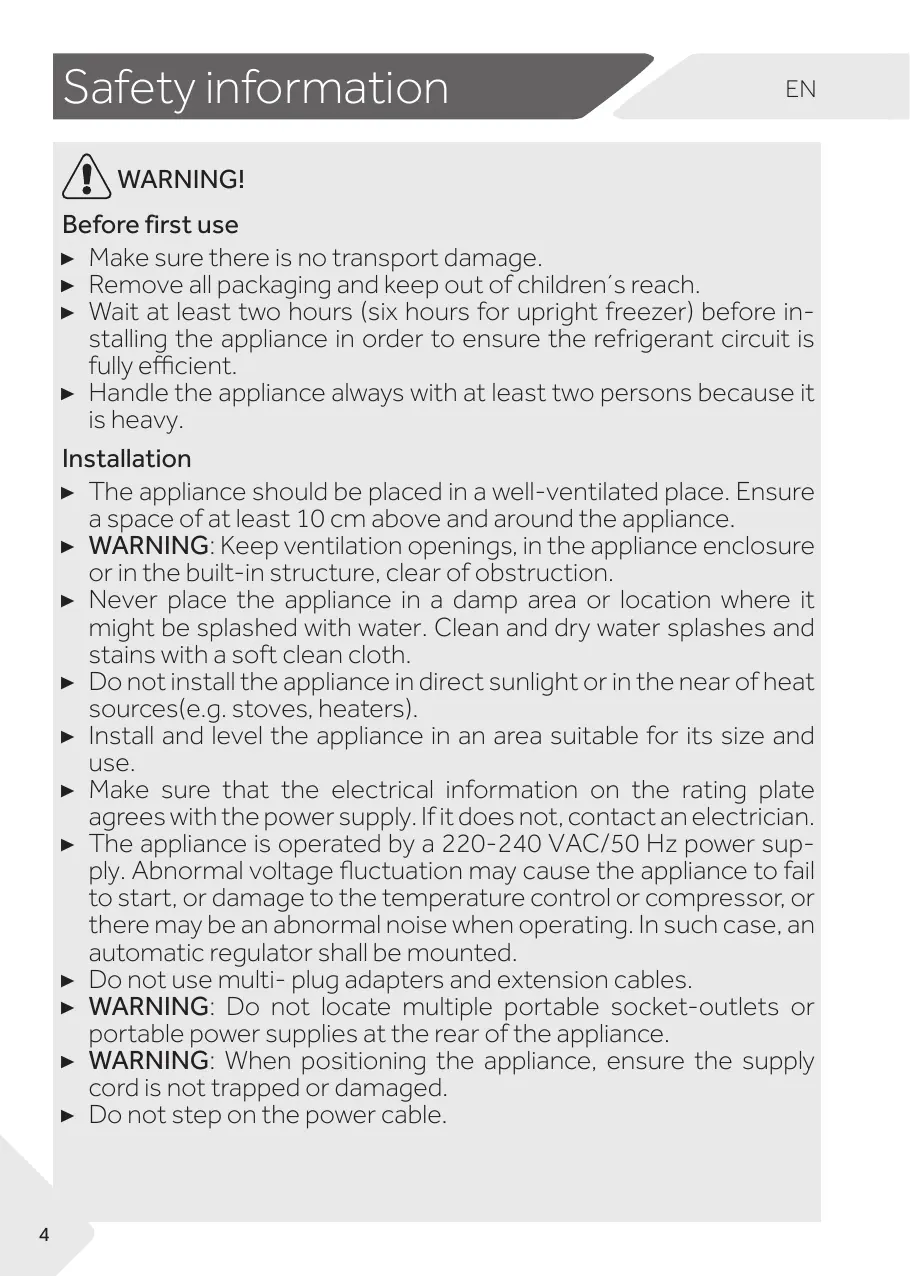 Before first use ▶ Make sure there is no transport damage. ▶ Remove all packaging and keep out of children´s reach. ▶ Wait at least two hours (six hours for upright freezer) before installing the appliance in order to ensure the refrigerant circuit is fully efficient. ▶ Handle the appliance always with at least two persons because it is heavy. Installation ▶ The appliance should be placed in a well-ventilated place. Ensure a space of at least 10 cm above and around the appliance. ▶ WARNING: Keep ventilation openings, in the appliance enclosure or in the built-in structure, clear of obstruction. ▶ Never place the appliance in a damp area or location where it might be splashed with water. Clean and dry water splashes and stains with a soft clean cloth. ▶ Do not install the appliance in direct sunlight or in the near of heat sources(e.g. stoves, heaters). ▶ Install and level the appliance in an area suitable for its size and use. ▶ Make sure that the electrical information on the rating plate agrees with the power supply. If it does not, contact an electrician. ▶ The appliance is operated by a 220-240 VAC/50 Hz power supply. Abnormal voltage fluctuation may cause the appliance to fail to start, or damage to the temperature control or compressor, or there may be an abnormal noise when operating. In such case, an automatic regulator shall be mounted. ▶ Do not use multi- plug adapters and extension cables. ▶ WARNING: Do not locate multiple portable socket-outlets or portable power supplies at the rear of the appliance. ▶ WARNING: When positioning the appliance, ensure the supply cord is not trapped or damaged. ▶ Do not step on the power cable.