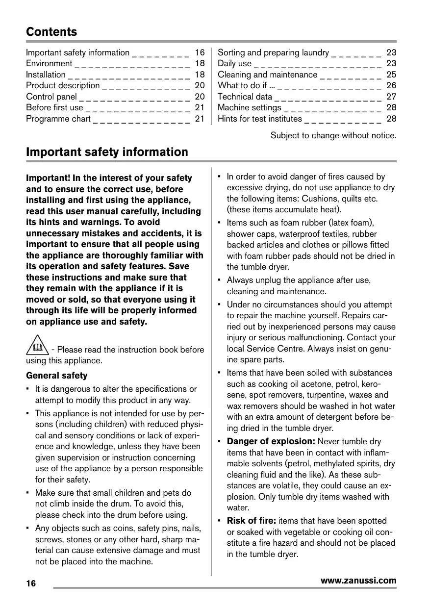 • In order to avoid danger of fires caused by excessive drying, do not use appliance to dry the following items: Cushions, quilts etc. (these items accumulate heat). • Items such as foam rubber (latex foam), shower caps, waterproof textiles, rubber backed articles and clothes or pillows fitted with foam rubber pads should not be dried in the tumble dryer. • Always unplug the appliance after use, cleaning and maintenance. • Under no circumstances should you attempt to repair the machine yourself. Repairs carried out by inexperienced persons may cause injury or serious malfunctioning. Contact your local Service Centre. Always insist on genuine spare parts. • Items that have been soiled with substances such as cooking oil acetone, petrol, kerosene, spot removers, turpentine, waxes and wax removers should be washed in hot water with an extra amount of detergent before being dried in the tumble dryer. • Danger of explosion: Never tumble dry items that have been in contact with inflammable solvents (petrol, methylated spirits, dry cleaning fluid and the like). As these substances are volatile, they could cause an explosion. Only tumble dry items washed with water. • Risk of fire: items that have been spotted or soaked with vegetable or cooking oil constitute a fire hazard and should not be placed in the tumble dryer. www.zanussi.com
