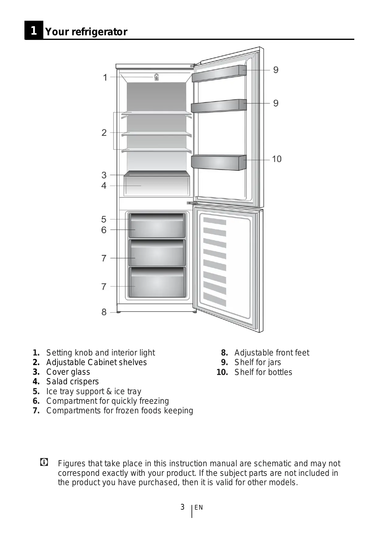 8. Adjustable front feet 9. Shelf for jars 10. Shelf for bottles
