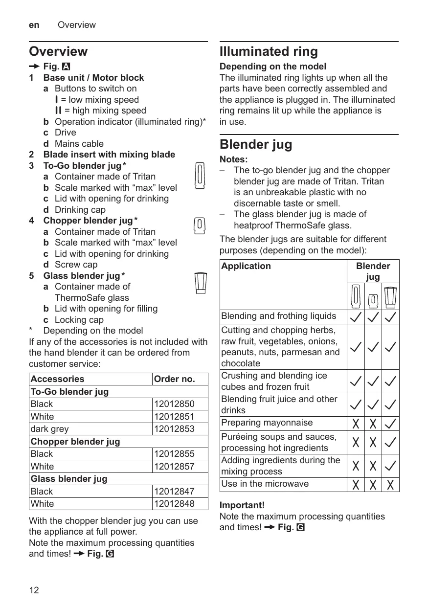 1 Base unit / Motor block a Buttons to switch on t = low mixing speed u = high mixing speed b Operation indicator (illuminated ring)* c Drive d Mains cable 2 Blade insert with mixing blade 3 To-Go blender jug * a Container made of Tritan b Scale marked with “max” level c Lid with opening for drinking d Drinking cap 4 Chopper blender jug * a Container made of Tritan b Scale marked with “max” level c Lid with opening for drinking d Screw cap 5 Glass blender jug * a Container made of ThermoSafe glass b Lid with opening for filling c Locking cap * Depending on the model If any of the accessories is not included with the hand blender it can be ordered from customer service: Accessories To-Go blender jug Black White dark grey Chopper blender jug Black White Glass blender jug Black White
