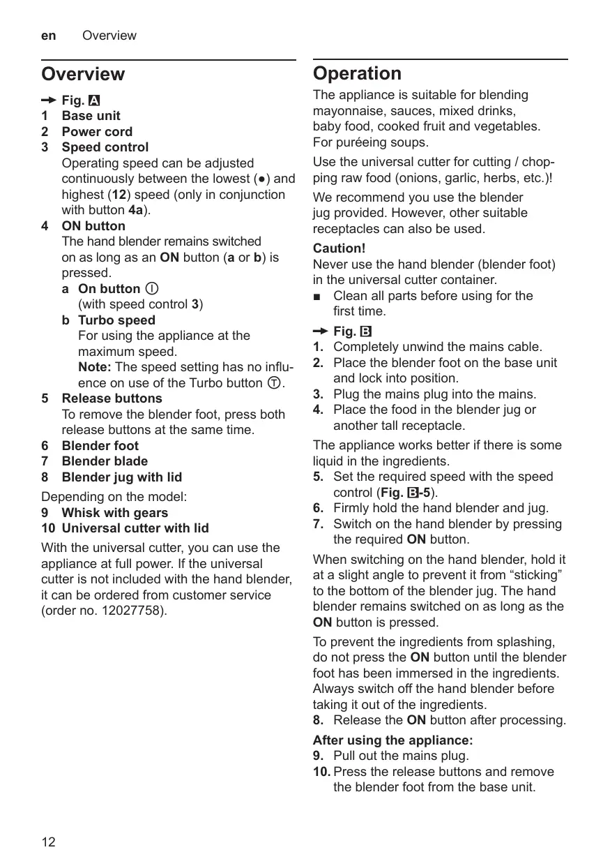 For puréeing soups. Use the universal cutter for cutting / chopping raw food (onions, garlic, herbs, etc.)! We recommend you use the blender jug provided. However, other suitable receptacles can also be used. Caution! Never use the hand blender (blender foot) in the universal cutter container. ■ Clean all parts before using for the first time. X Fig. B 1. Completely unwind the mains cable. 2. Place the blender foot on the base unit and lock into position. 3. Plug the mains plug into the mains. 4. Place the food in the blender jug or another tall receptacle. The appliance works better if there is some liquid in the ingredients. 5. Set the required speed with the speed control (Fig. B-5). 6. Firmly hold the hand blender and jug. 7. Switch on the hand blender by pressing the required ON button. When switching on the hand blender, hold it at a slight angle to prevent it from “sticking” to the bottom of the blender jug. The hand blender remains switched on as long as the ON button is pressed. To prevent the ingredients from splashing, do not press the ON button until the blender foot has been immersed in the ingredients. Always switch off the hand blender before taking it out of the ingredients. 8. Release the ON button after processing. After using the appliance: 9. Pull out the mains plug. 10. Press the release buttons and remove the blender foot from the base unit.