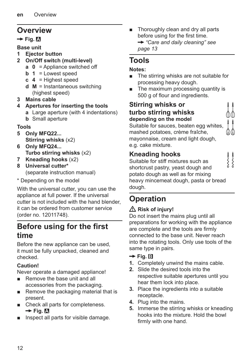 1 Ejector button 2 On/Off switch (multi-level) a 0 = Appliance switched off b 1 = Lowest speed c 4 = Highest speed d M = Instantaneous switching (highest speed) 3 Mains cable 4 Apertures for inserting the tools a Large aperture (with 4 indentations) b Small aperture Tools 5 Only MFQ22... Stirring whisks (x2) 6 Only MFQ24... Turbo stirring whisks (x2) 7 Kneading hooks (x2) 8 Universal cutter* (separate instruction manual) * Depending on the model With the universal cutter, you can use the appliance at full power. If the universal cutter is not included with the hand blender, it can be ordered from customer service (order no. 12011748).