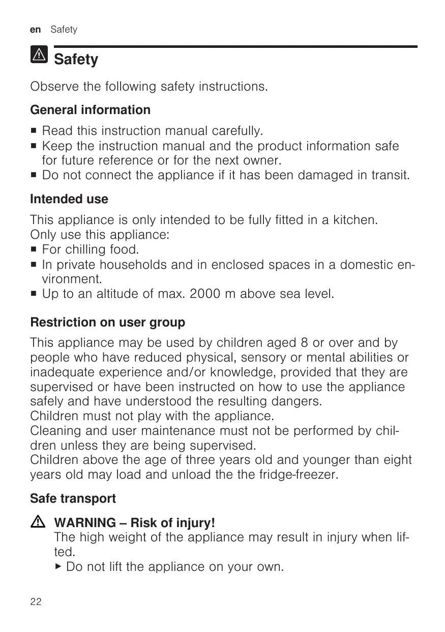 Table of contents Safety 22 General information 22 Intended use 22 Restriction on user group 22 Safe transport 22 Safe installation 23 Safe use 24 Damaged appliance 25