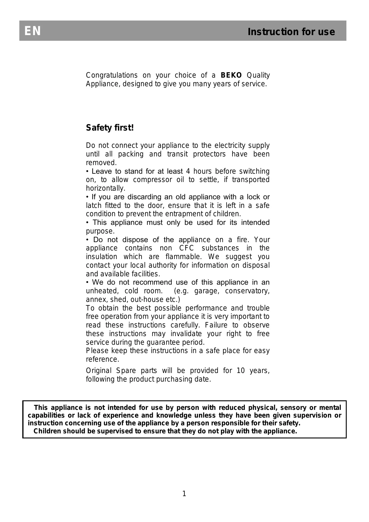 Ihr Gerät verwendet ein umweltverträgliches Kältemittel, R600a (nur unter bestimmten Umständen brennbar). Um einen einwandfreien Betrieb Ihres Gerätes sicherzustellen, beachten Sie bitte folgende Vorschriften: Réversibilité de la porte /11 Mise en fonctionnement /11 Entreposage des produits a conserver /11 Réglage de la température /12 Changement de la lampe /12 Congélation des produits frais /12 Conservation des produits congelés /13 Production des cubes des glace /13 Décongélation /13 Dégivrage /13 Nettoyage /14 - Ne pas connecter votre appareil au réseau électrique avant d’avoir enlevé tout emballage ou pièce de protection pendant le transport - Laissez l’appareil rester pendant au moins 4 heures avant de le mettre en fonction, pour permettre la stabilisation de l'huile du compresseur, si l’appareil a été transporté horisontalement. - Si vous récyclez un vieil appareil ayant un verrou attaché dans la porte, assurez-vous qu’il a été laissé en bonne condition pour prevenir l’entrée des enfants. - L’appareil doit être utilisé exclusivement dans le but pour lequel il a été projeté. - Ne pas jeter l’appareil au feu. Votre appareil contient des substances sans CFC dans l’isolation , qui sont inflammables. Nous vous suggérons de contacter votre autorité locale pour recevoir des informations concernant le récyclage et les centres recommandés. - Nous ne récomandons pas l’utilisation de l’appareil dans un espace non chauffé, froid. (ex: garage, annexe, etc.) - Pour obtenir un fonctionnément meilleur et irréprochable de votre appareil il est très important de lire attentivement ces instructions. Si vous ne respectez pas ces instructions votre droit de recevoir service gratuit sera annulé. - Nous vous prions de garder ces instructions dans une place sure pour réfèrence rapide. Les pièces détachées d’origine sont disponibles pendant 10 ans, à compter de la date d’achat du produit.