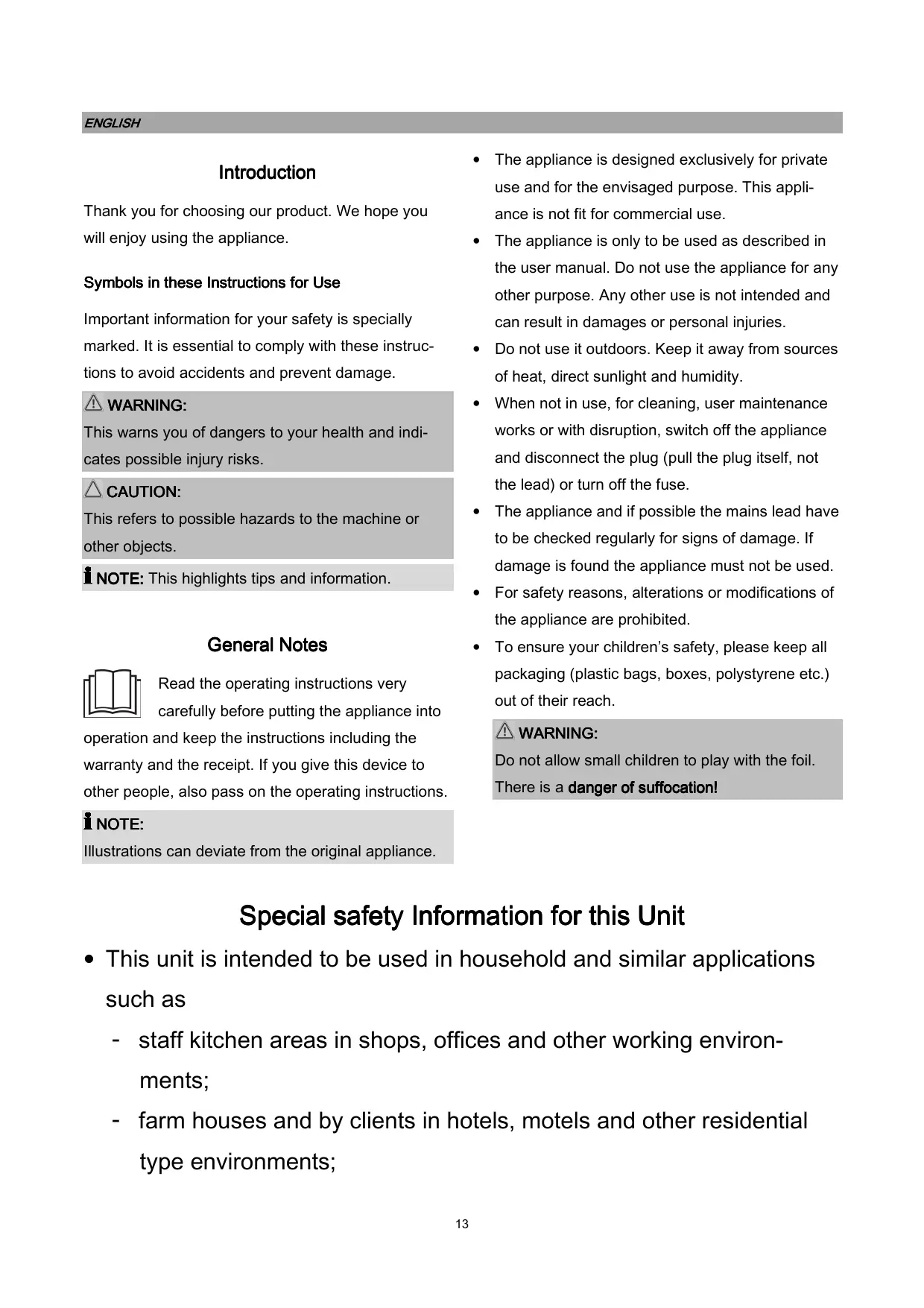 NING: operation and keep the instructions including the warranty and the receipt. If you give this device to Do not allow small children to play with the foil. other people, also pass on the operating instructions. There is a danger danger of suffocation! suffocation! NOTE: NOTE: Illustrations can deviate from the original appliance. Special safety Information for this Unit