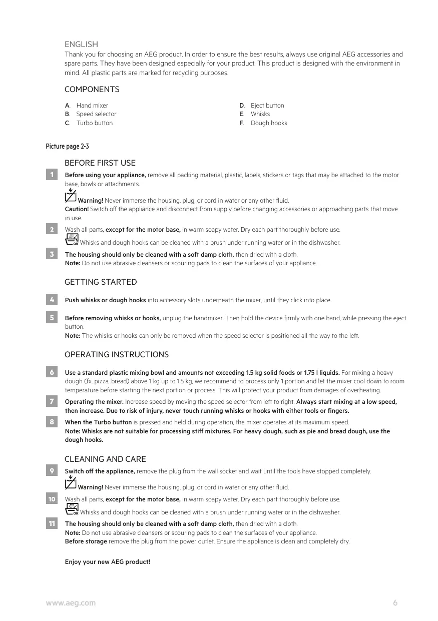 ENGLISH Thank you for choosing an AEG product. In order to ensure the best results, always use original AEG accessories and spare parts. They have been designed especially for your product. This product is designed with the environment in mind. All plastic parts are marked for recycling purposes.