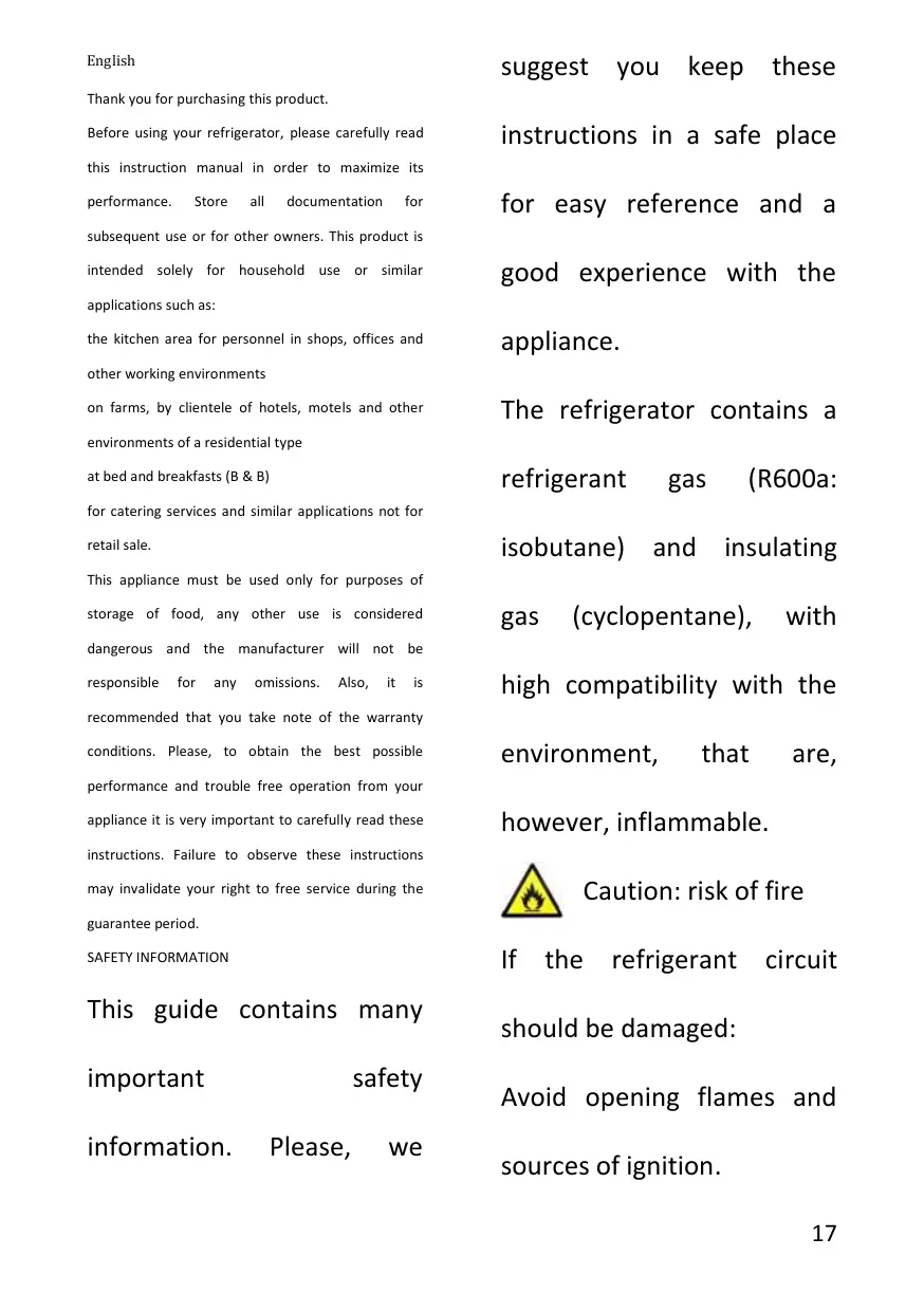 This appliance must be used only for purposes of storage of food, any other use is considered