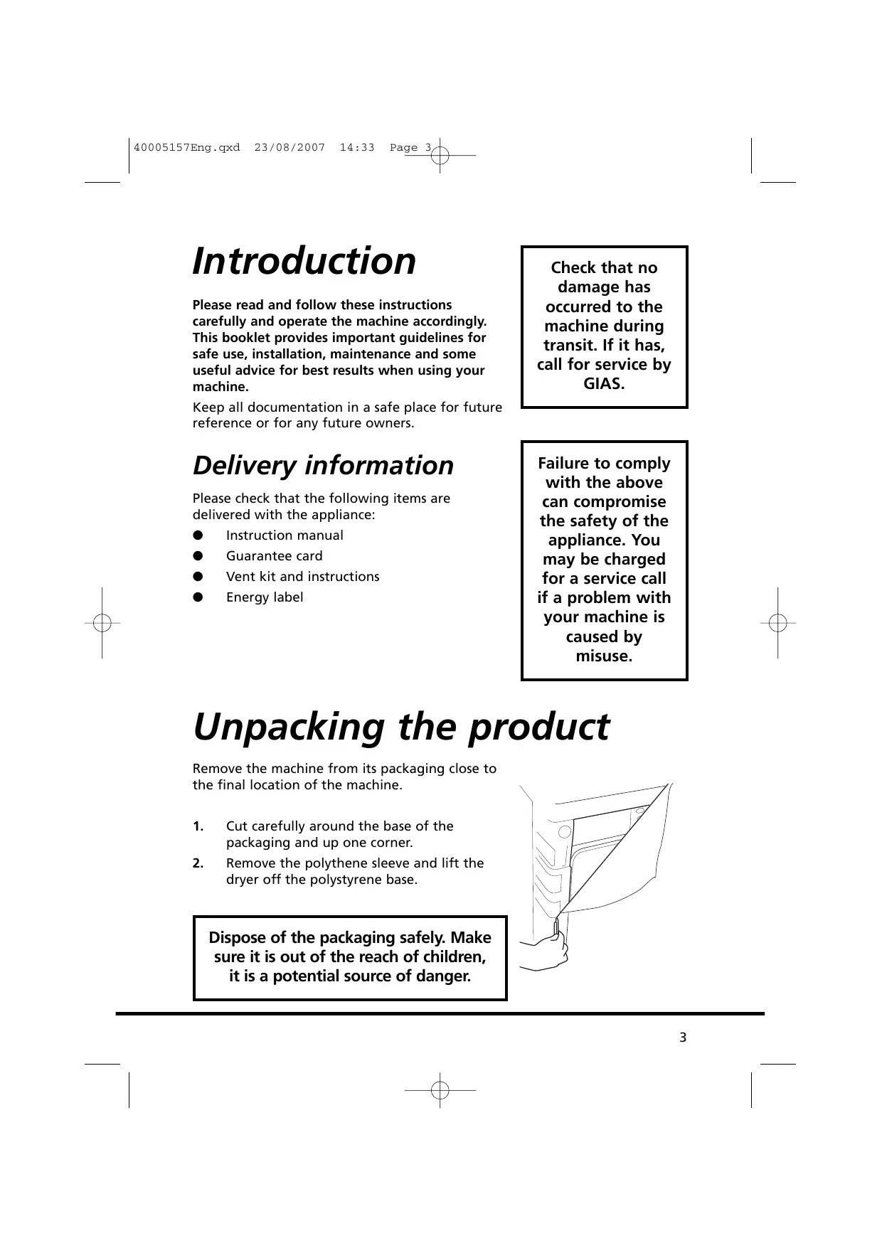 40005157Eng.qxd 23/08/2007 14:33 Page 3 Introduction Please read and follow these instructions carefully and operate the machine accordingly. This booklet provides important guidelines for safe use, installation, maintenance and some useful advice for best results when using your machine. Check that no damage has occurred to the machine during transit. If it has, call for service by GIAS. Keep all documentation in a safe place for future reference or for any future owners. Delivery information Please check that the following items are delivered with the appliance: