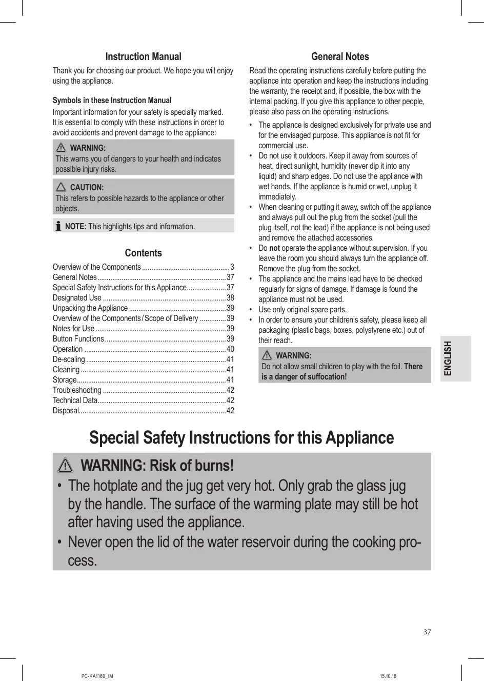 Model: PC-KA 1169 Power supply: 220 - 240 V~, 50 / 60 Hz Power consumption:900 W Filling quantity: 1.5 litre Protection class: Net weight: approx. 1.9 kg The right to make technical and design modifications in the course of continuous product development remains reserved. This appliance has been tested according to all relevant current CE guidelines, such as electromagnetic compatibility and low voltage directives, and has been constructed in accordance with the latest safety regulations.