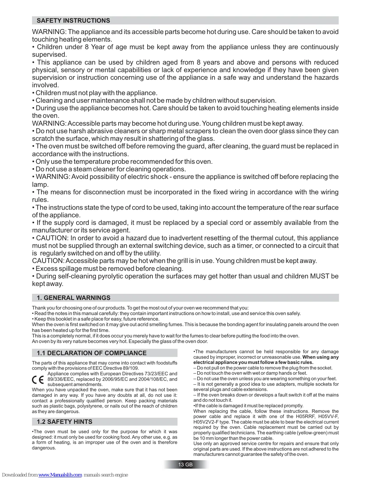CONTENTS Safety Instructions 1. General Warnings 1.1 Declaration Of Compliance 1.2 Safety Hints 13 Installation . 14 Fitting The Oven Into The Kitchen Unit 1.5 Important … 1.6 Connecting To The Power Supply 1.7 Oven Equipment (according To The Model 2. Useful Tips …