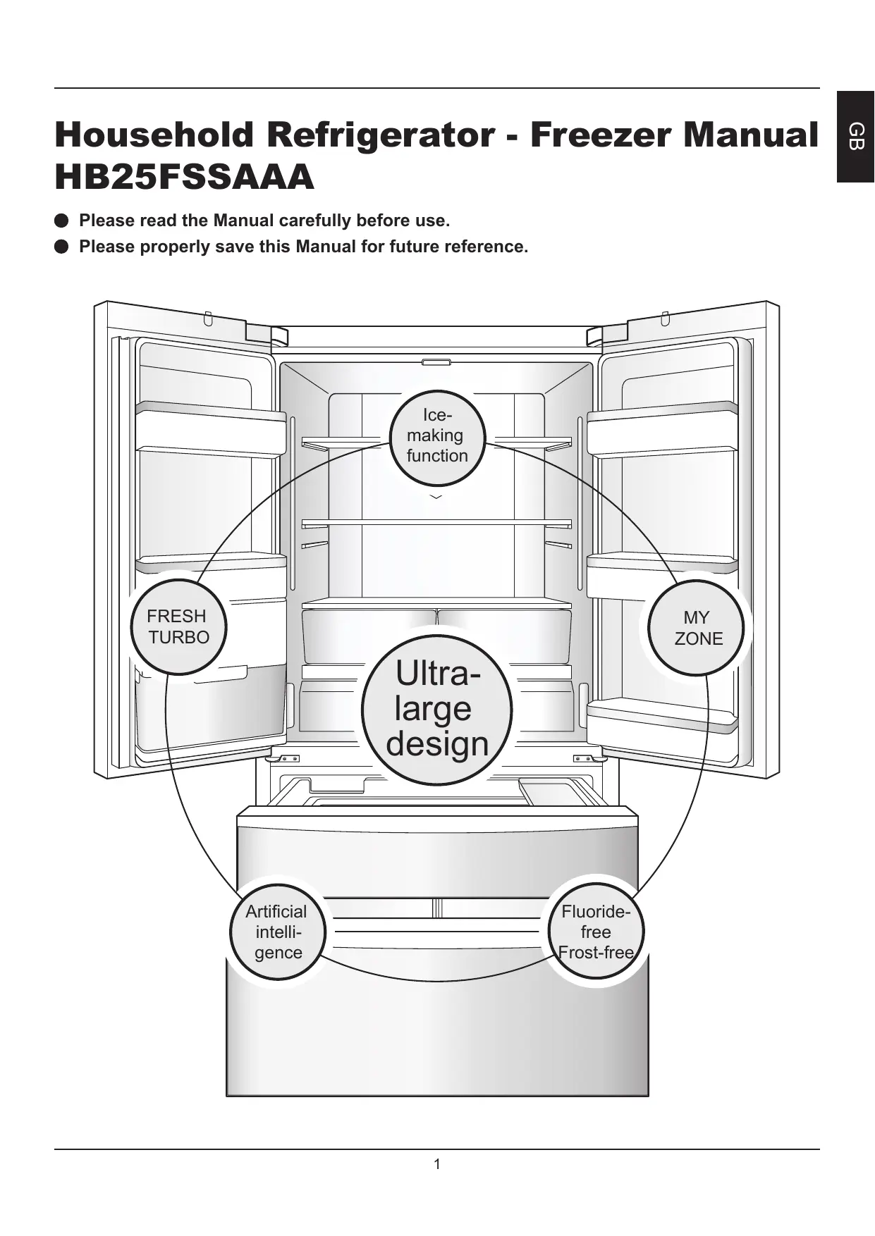 HB25FSSAAA is a French style side-by-side door household Refrigerator - Freezer. Please read this Manual carefully to help you use this product safely and comfortably. For safe use of this product, please read the Safety Instructions carefully before use of the product.